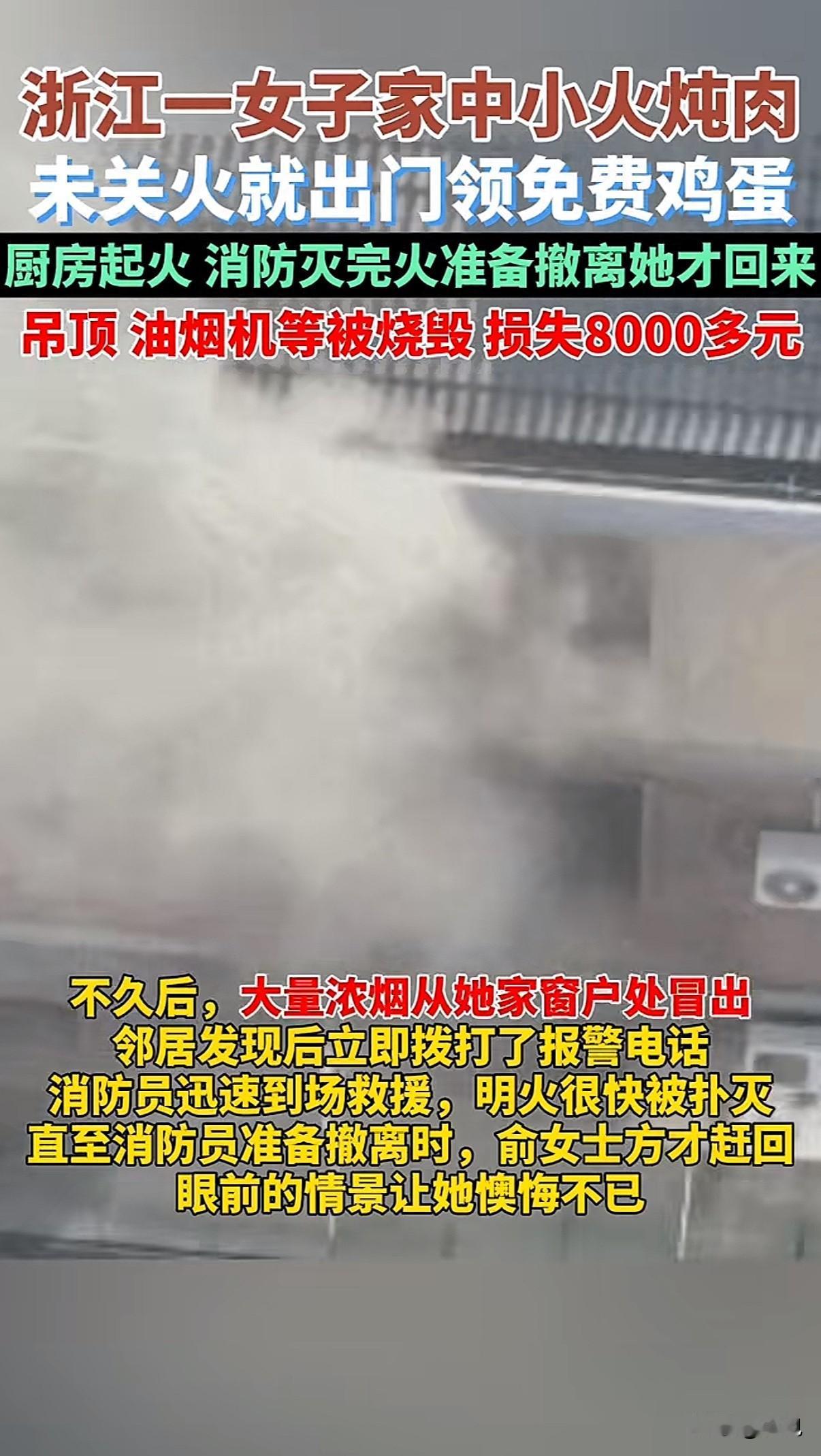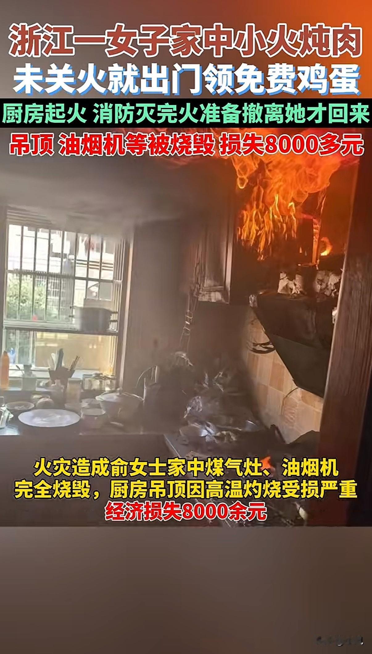 为了几个免费鸡蛋,烧掉八千多块厨房,这可能是最贵的一篮鸡蛋了。 嘉兴的俞女士中午在家用小火炖肉。灶上开着火,她人已经走到了门口。为啥这么急?邻居一句“快去,那边领鸡蛋快结束了”,让她直接忘了关火这件事。 “我就想着,走过去五分钟,体验一下十分钟,回来肉肯定没炖好,时间刚好。”这是她后来跟消防员解释的话。 可厨房里的火不等人。锅里的水烧干了,肉烧焦了,最后火苗直接窜起来。抽油烟机先是冒浓烟,接着被明火舔舐。等楼下邻居闻到刺鼻焦味,抬头看见黑烟从窗户涌出时,已经晚了。 消防车赶到时,门缝里都在往外渗烟。敲门没人应,只能强行破拆。门撞开的瞬间,热浪混着刺鼻的焦糊味扑出来。厨房里噼啪作响,整个吊顶都在燃烧。 “我的锅!我的厨房!”这是俞女士提着那篮用透明塑料盒装着的鸡蛋跑回来时,喊出的第一句话。盒子里大概有十来个鸡蛋,安安稳稳地躺着。而屋里,消防水带正哗哗冲着烧成空架子的油烟机。 损失清单很快列出来:煤气灶全毁,油烟机烧得只剩铁壳,铝扣板吊顶熔化了七八块,墙壁熏得漆黑……粗粗一算,八千多。那篮鸡蛋市值不超过五十块。 消防员一边收拾器材,一边摇头:“小火炖煮最容易大意,看着没事,其实危险就在几分钟里。” 最让人后怕的是,起火点离燃气管道非常近。如果火势蔓延过去,后果不堪设想。那就不只是烧一个厨房的问题了。 事后有人问,那鸡蛋领到了吗?领到了,活动方很守信用。只是这篮鸡蛋,现在安静地放在她一片狼藉的厨房角落,显得格外扎眼。 安全提示贴了一万次,不如一次真教训。但真希望这样的教训,别再有人用这种方式去体验。离开厨房前,低头看一眼灶台,这个动作比什么都重要。