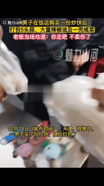 男子去饭店买了份炒饼,随后准备付钱走的时候,店主却拦住了他,看见男子另外打包的调料和蒜,店主直接劝退:“不卖你了,你走吧!” 网友:“支持店家的做法。” 12月14日,天津,一饭店来了位男子要了一份炒饼,很快店主就将炒饼做好并打包好给了男子,而男子转身又自己打包了辣椒油和小咸菜,还有5头蒜。 正当男子付钱要离开的时候,店主看见了,直接拦住男子,看了看男子打包的后心里一阵不舒服,说:“你走吧,不卖你了。” 店主说:“炒饼是10块钱一份,打包辣椒油和小咸菜倒没什么,拿5头蒜就太过分了,自己在市场上买的蒜4块5一斤,那5头蒜差不多有8两,算成钱也有3块多,在店里吃可以,这带走换谁做生意都不乐意。” 店主说的也没毛病,在店里吃,吃多少没人会说,但这带走还带走5头蒜,的确让人难以理解,这是贪小便宜不够啊,如果都这样的话,这家店也就干不下去了。 做生意就是为了赚钱,不是来赔本给人占小便宜的,没有特别的情况,这种人的毛病不应该惯! 对此,您有什么看法呢?