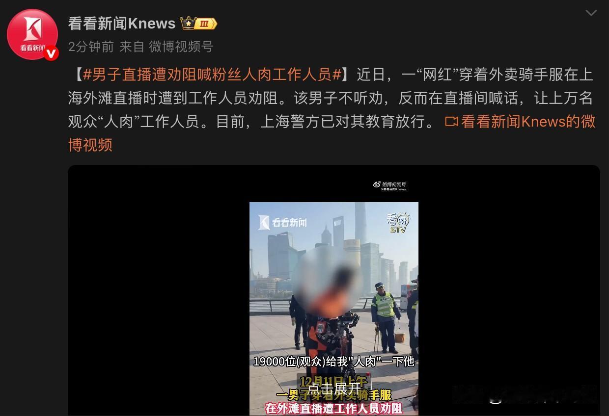有的网红大概把自己当成了神人了吧,居然敢在直播间号召自己的粉丝人肉执法者!近日在上海的外滩有一网红身着骑手服饰直播,好家伙在直播居然有19000千多名粉丝同时在线。然而,这地方是游客区域是不允许直播的,所以执法人员上前劝阻。按照正常人的思维,执法人员前来劝导,证明这里肯定是不能直播的,理应迅速撤离或者换地方。这位网红可能觉得自己有上万人撑腰,居然煽动19000直播间粉丝人肉执法者,而且还挑衅说你们打我呀!看到这里我简直都气笑了,这家伙该是多么有坑啊,居然胆大如斯。此外,我有点想不通了,外卖小哥哪有时间开直播啊?穿个骑手服饰开直播是不是属于欺骗粉丝?