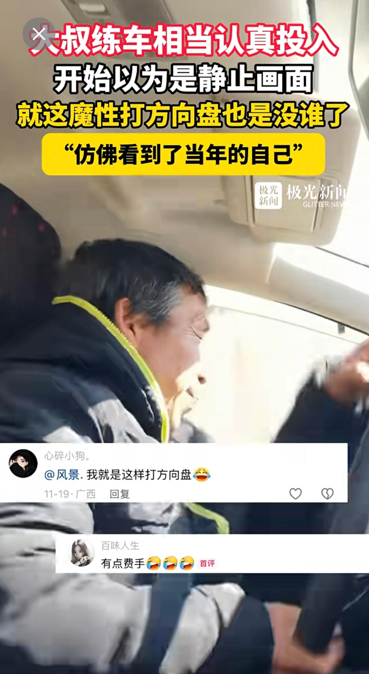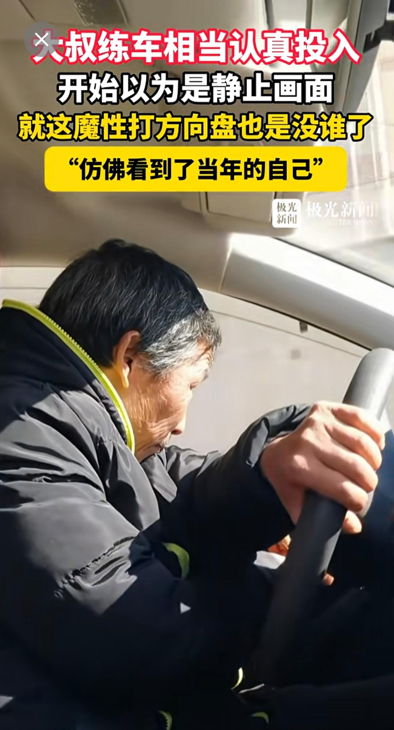 大叔练车相当认真投入,开始以为是静止画面,就这魔性打方向盘也是没谁了,“仿佛看到了当年的自己”
