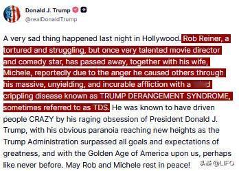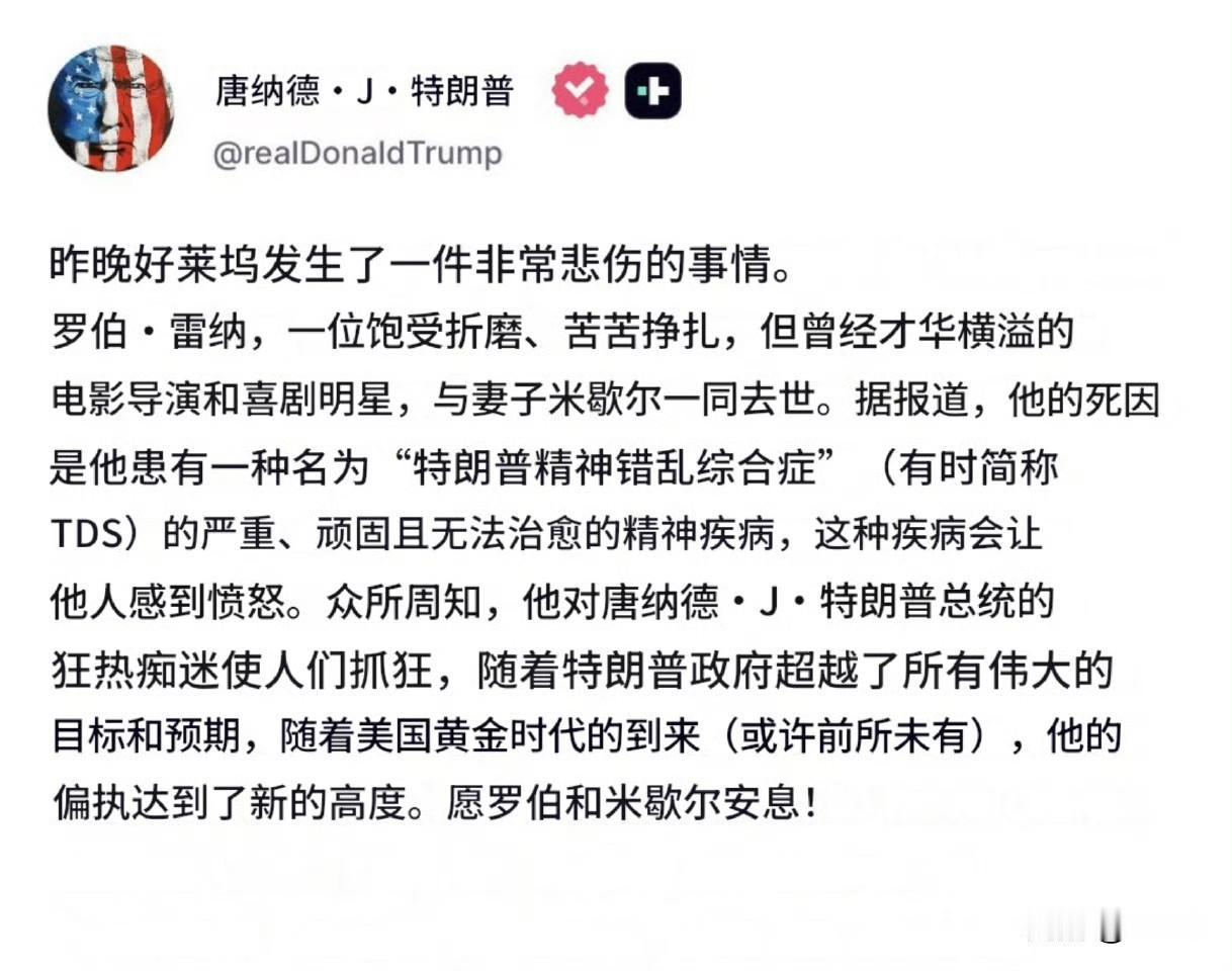 最新消息——特朗普声称罗伯·莱纳夫妇已去世,“据称死因是由于他们因罹患名为'特朗普精神错乱综合征'的顽固性精神致残疾病,长期以极端、偏执且不可救药的症状激怒他人所导致。”有美国人表示:“这是特朗普最荒诞的一条文章之一。”
