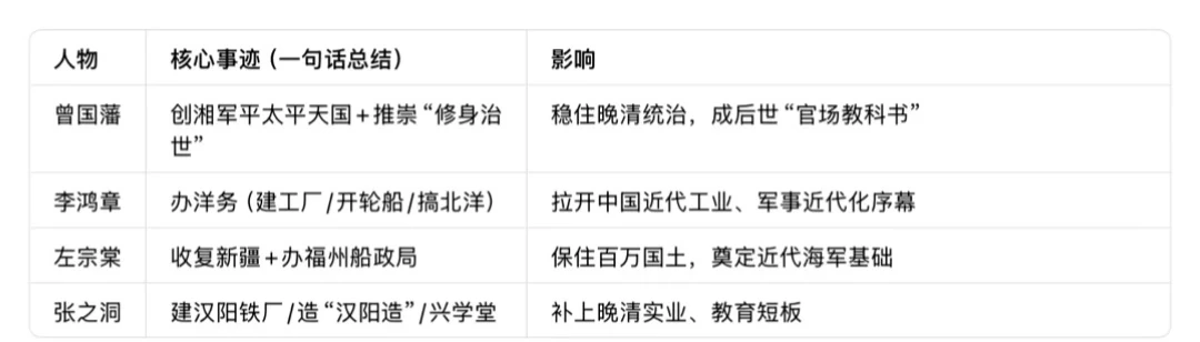 谁是晚清最后的“顶流重臣”? 这四位爷的简历一甩,直接把“能臣天花板”焊死了👇 🔍先认人:晚清F4天团 • 曾国藩(湖南湘乡):61岁,湘军创始人,“文正”谥号是古代文臣最高荣誉 • 李鸿章(安徽合肥):78岁,洋务运动“包工头”,北洋水师是他的“代表作” • 左宗棠(湖南湘阴):73岁,抬棺收复新疆的狠人,湘军战神级领袖 • 张之洞(河北南皮):72岁,“汉阳造”爸爸,洋务派里的“实业卷王” 💥他们到底多牛? • 官职卷到顶:四个全是总督+大学士(相当于现在的省委书记+政治局常委) • 功绩能救命: 曾国藩靠湘军平了太平天国,李鸿章搞洋务想“师夷长技”,左宗棠保住了新疆166万平方公里国土,张之洞建工厂修铁路给晚清续了命 • 谥号见地位: 文正(曾)>文忠(李)>文襄(左、张),追赠全是太傅/太保(皇帝的老师) 说直白点: 这四人是晚清的“消防栓”——哪着火了哪有他们,一边给快散架的大清补窟窿,一边偷偷搞近代化。 可惜时代烂透了,再牛的人也救不了注定要翻的船🚢