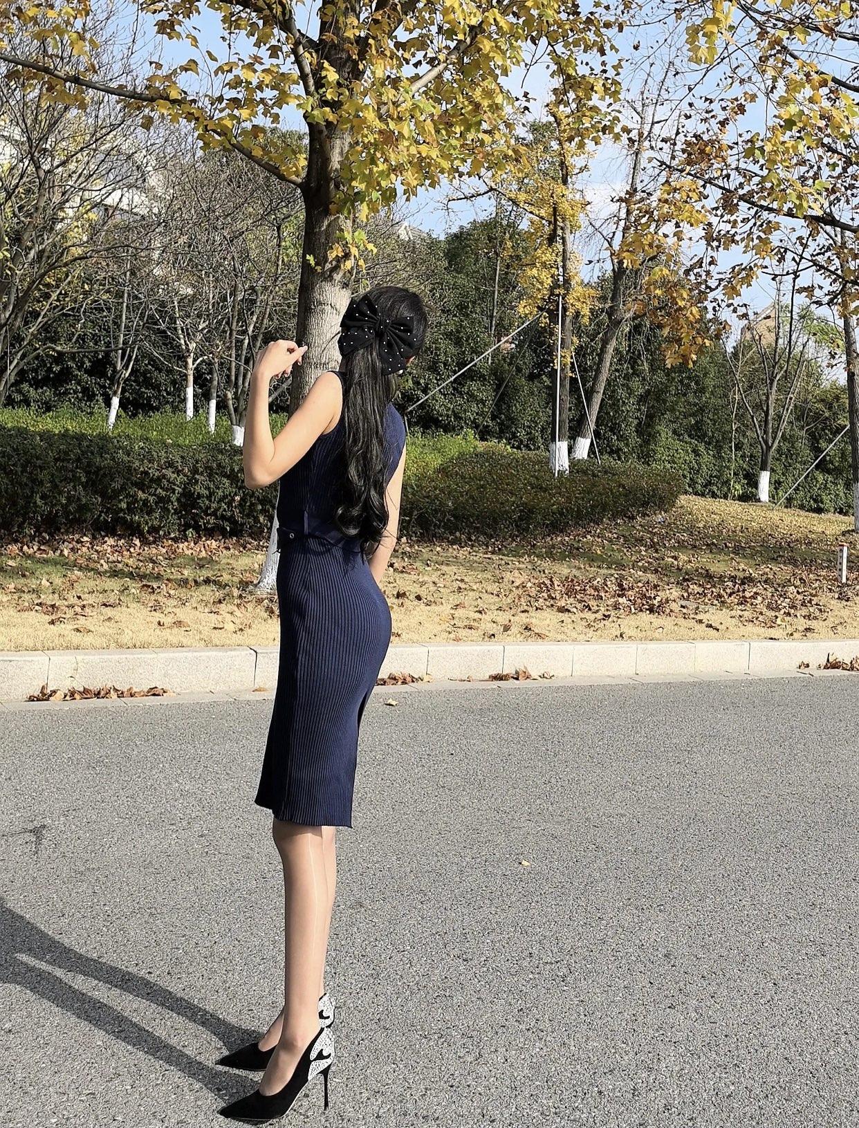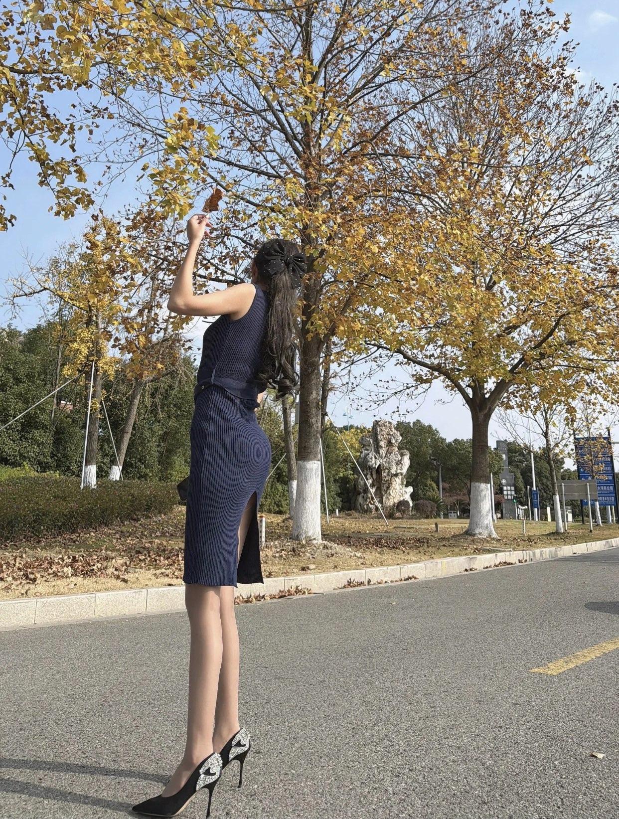 秋日漫步,优雅蓝裙与落叶相映成趣。