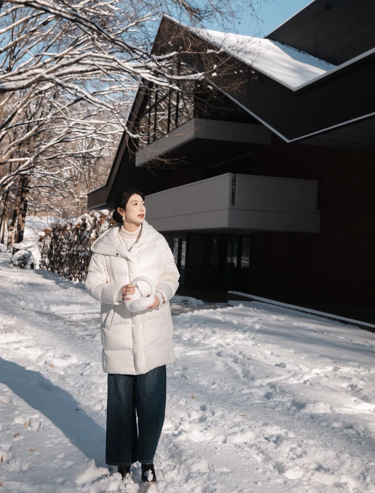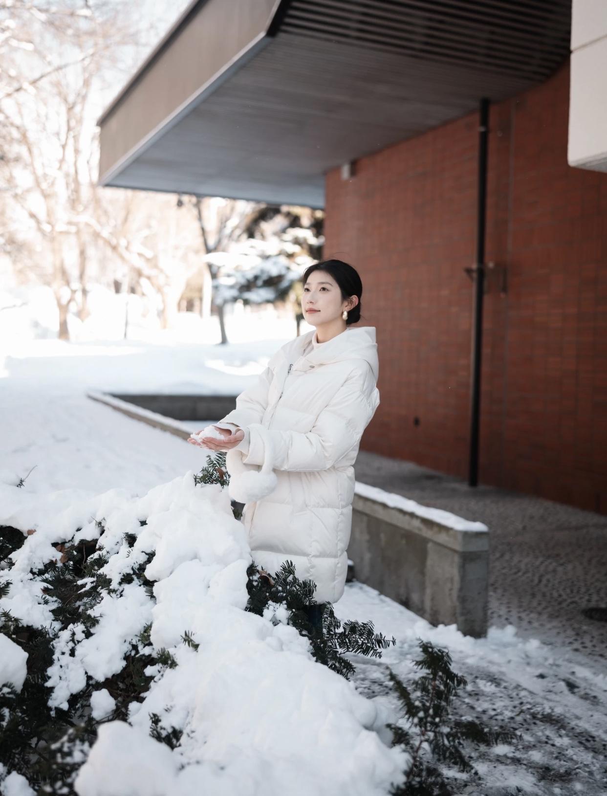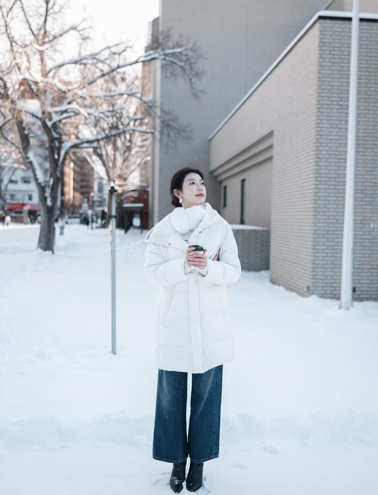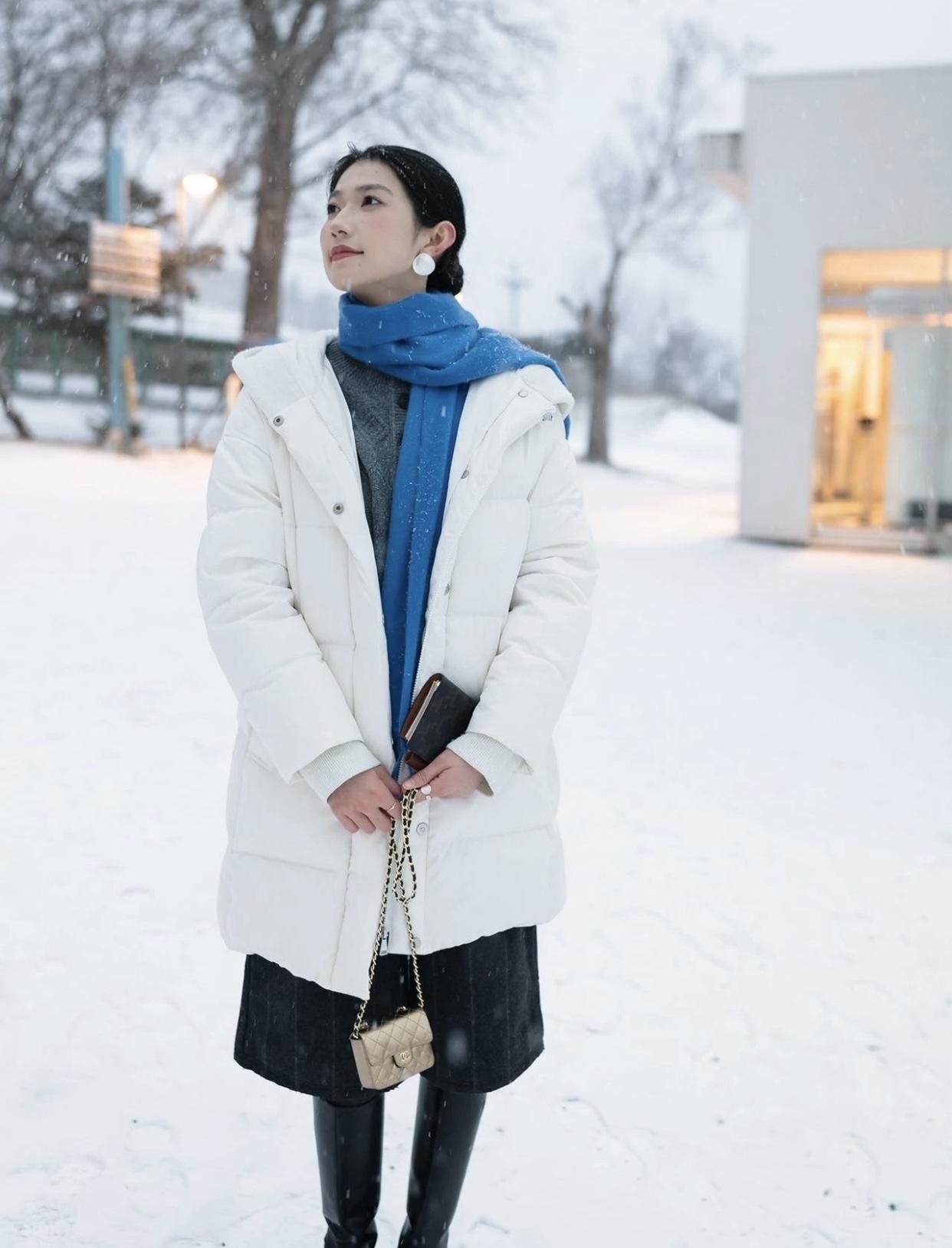 初雪打卡拍照冬日雪景中的时尚穿搭,白色羽绒服搭配蓝色围巾,温暖又时髦。
