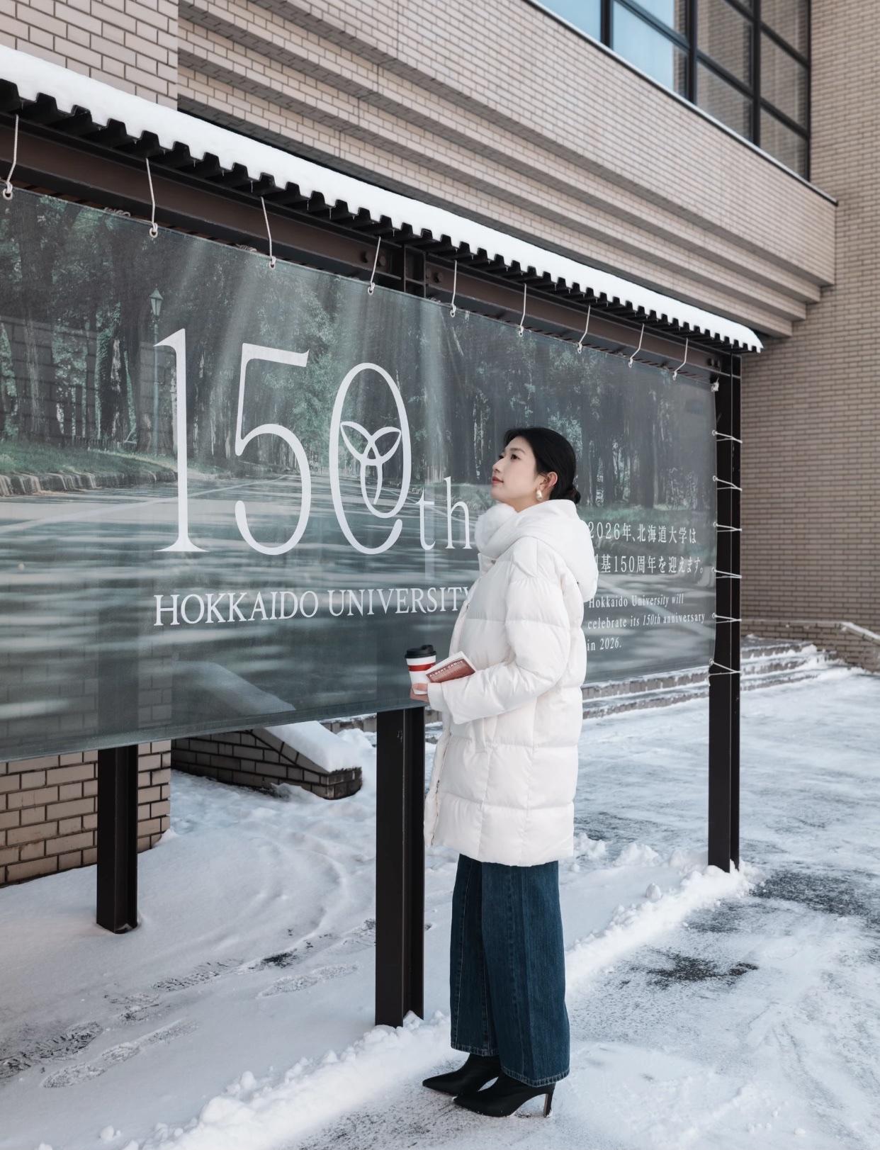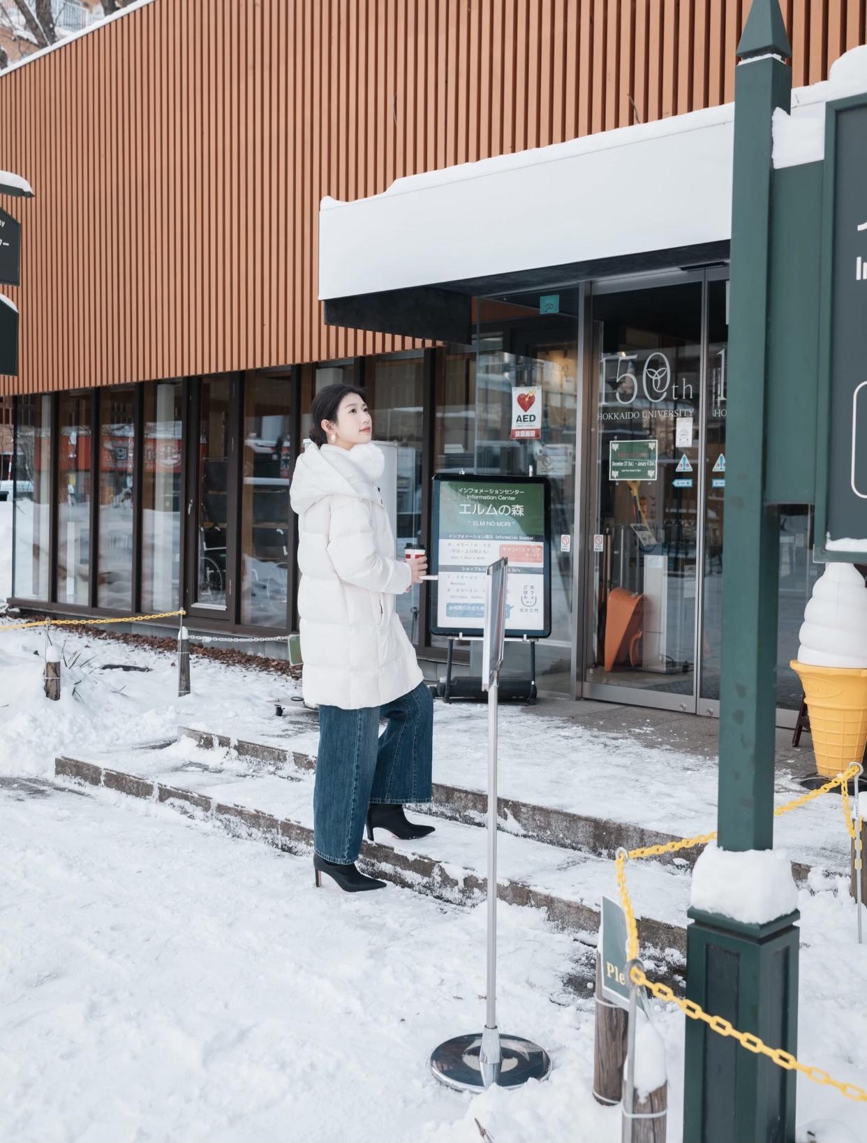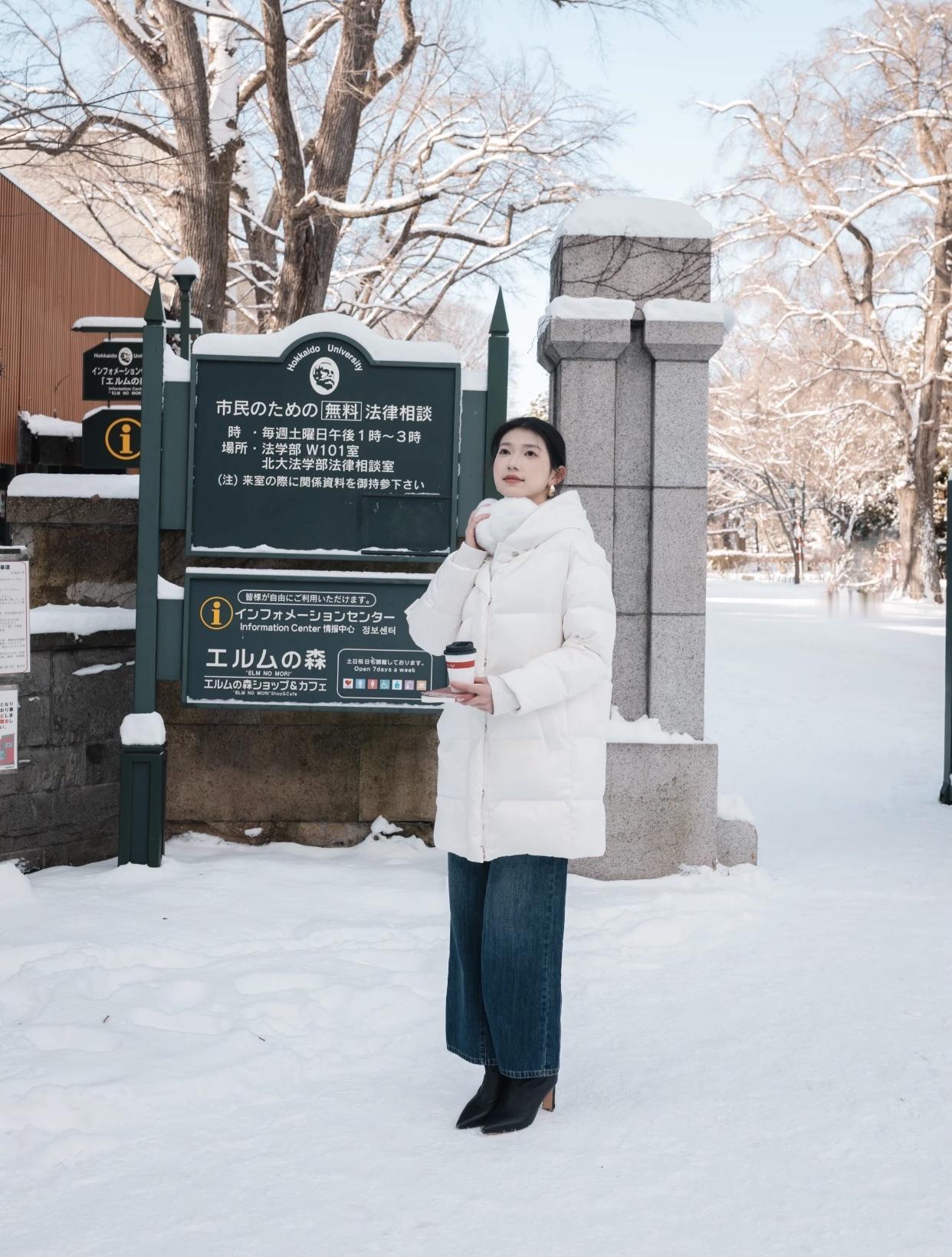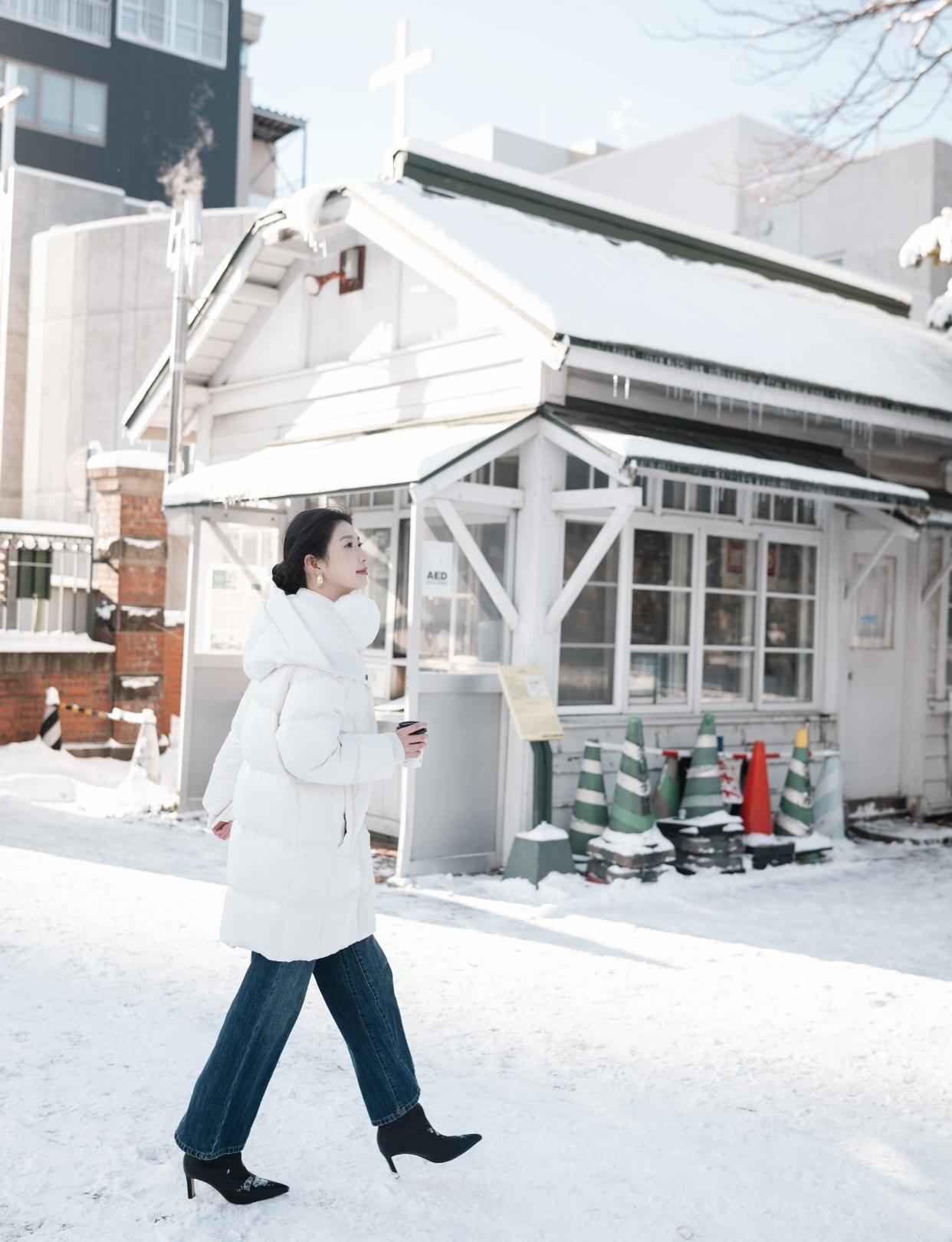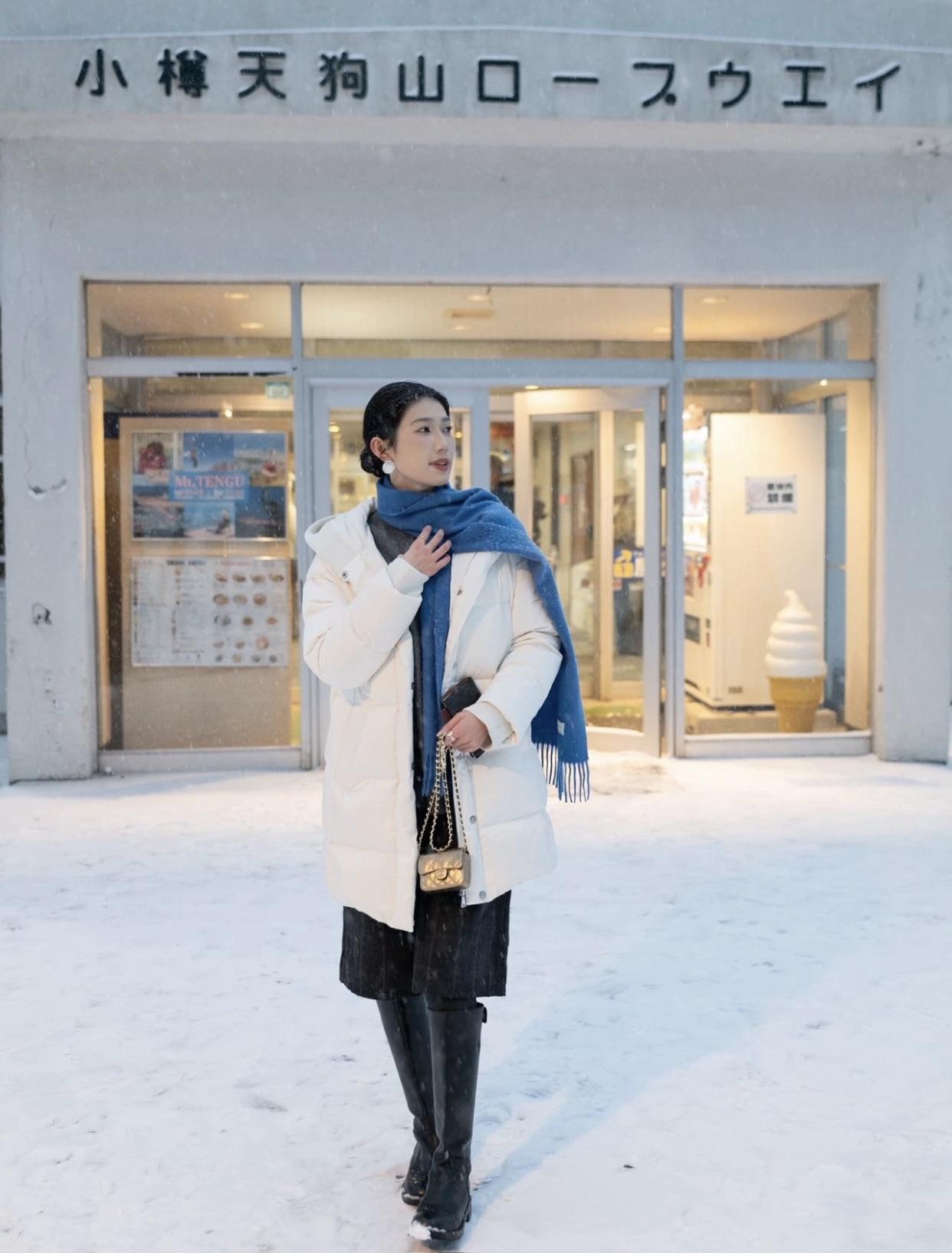 初雪打卡拍照冬日雪景中的时尚穿搭,白色羽绒服搭配蓝色围巾,温暖又时髦。