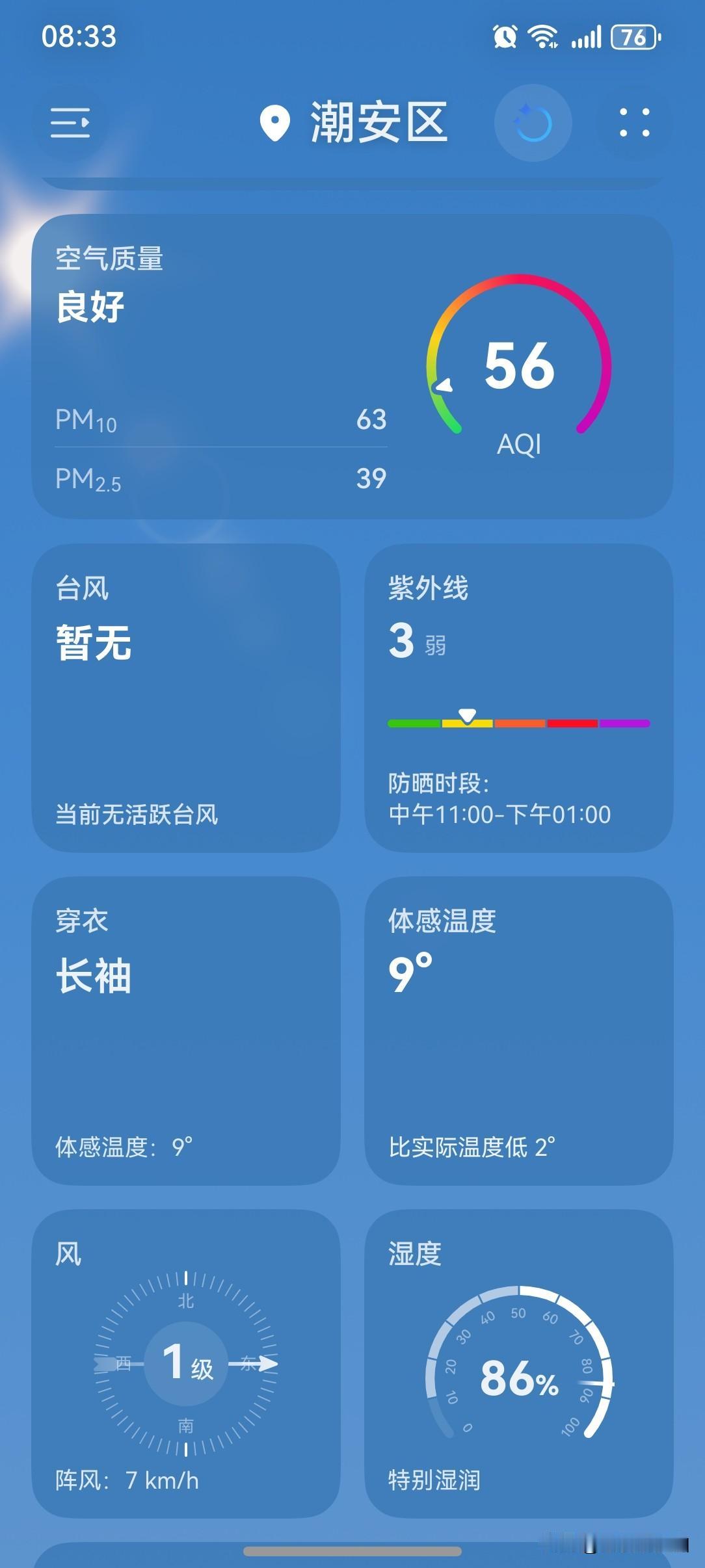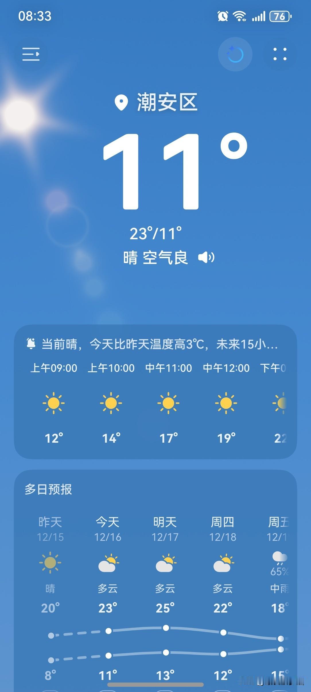 广东气温回升,但早晚较冷,需要注意根据温度增减衣物,别让感冒病毒有机可乘! 16~18日,我省西部市县云量偏多,间中有分散性零星小雨,其余市县以多云间晴天气为主,气温逐渐回升。 今天(16日),潮州喜提一个大好晴天,气温11~23℃,此刻气温11℃,体感温度9℃。 看看今天的天空,天气晴朗,阳光明媚,确实是个好天气! 不过,早晨六点的气温依然有点低,体感温度更低一点,总感觉有点冻手冻脚的。 现在的气温已经开始逐渐上升,今天的全天最高气温将会上升到23℃,暖洋洋的日子又回来了! 被冻了两天,不知道其他小伙伴们的感觉如何?反正我是一点也不想过那种冻手冻脚的日子,还是比较喜欢20℃+的天气!暖暖的,无比舒畅! 今天的这样天气,拼实力获得一个五星好评!气温上升,天气晴朗,就必须给好评! 如此天气!元芳,你怎么看? [捂脸][我想静静][笑哭][捂脸][我想静静][笑哭][捂脸][我想静静][笑哭]