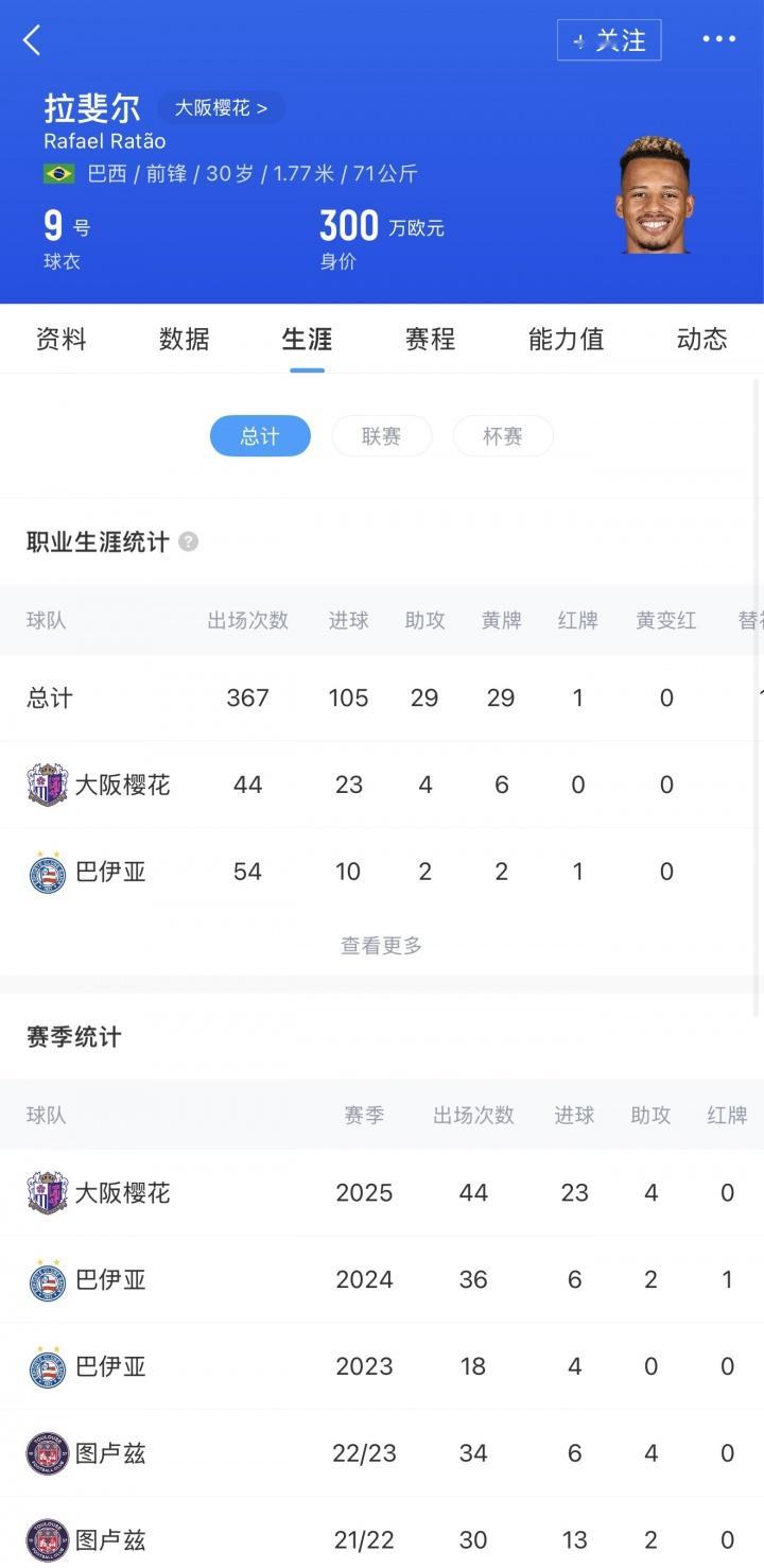 拉唐现年30岁,上赛季租借效力于大阪樱花,出场44次打入23球4助攻,目前他的德转身价是300万欧元。