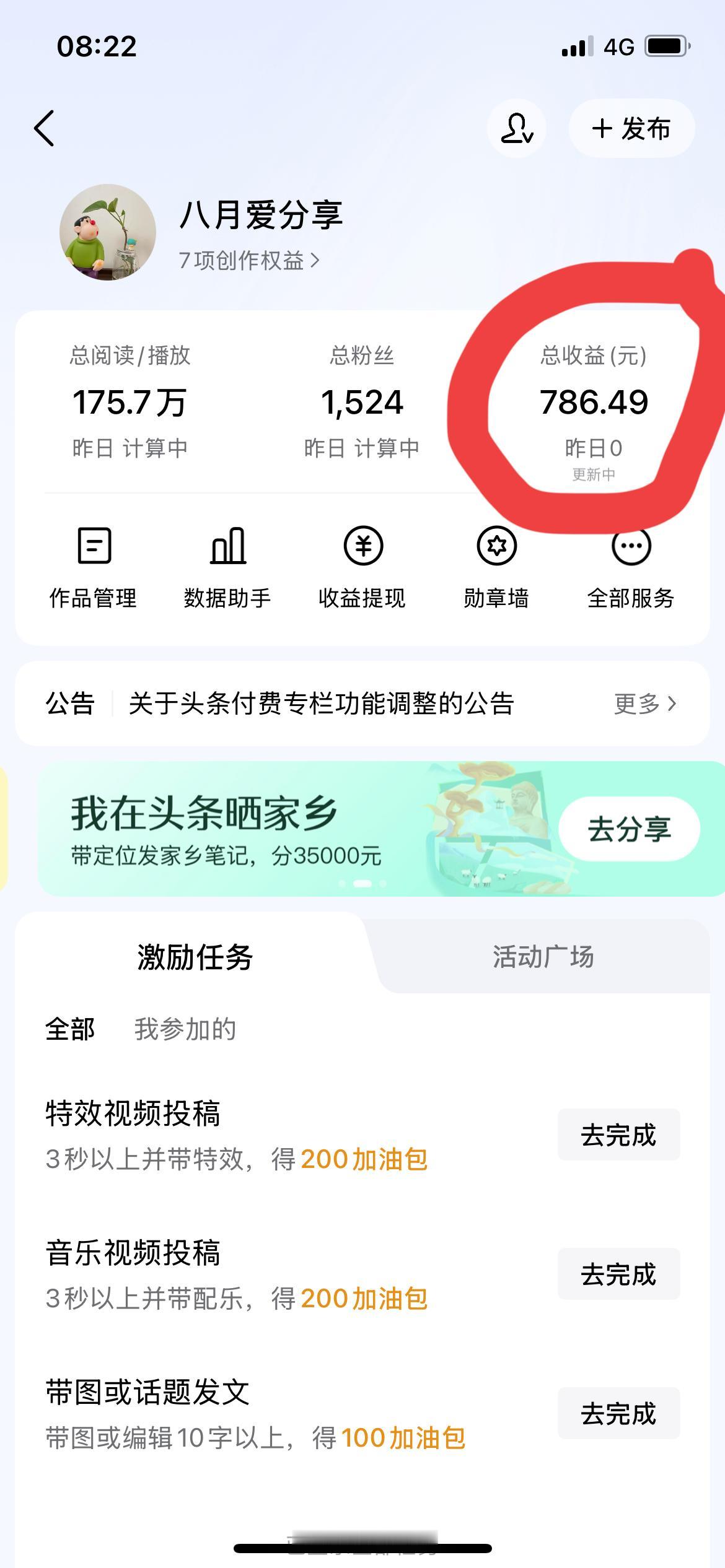 没有才华的我赚了786元 懵懵懂懂的啥都不会, 今年偶然一次发现, 原来头条是有收益的, 不管三七二十一, 直接开干,随时随地打开手机就码字, 一天三篇雷打不动, 一分几毛常有的事, 我不在乎, 这是零成本的事, 只要有阅读就有收益, 这就是对普通人最低的门槛, 唯一最难的事就是坚持✊, 朋友们,你们今年收益多少呢?