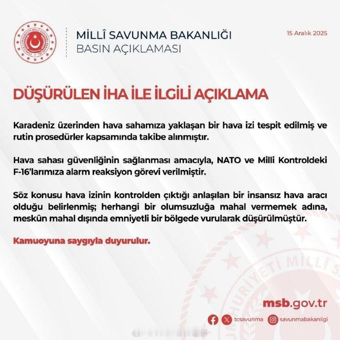 土耳其国防部发布声明称,土耳其一架F-16战斗机在黑海上空击落了一架失控的无人机,该无人机当时正接近土耳其边境。 “根据标准程序,我们发现了一架从黑海方向接近我国领空的空中目标,并对其进行了监视。 为确保领空安全,北约和国家指挥部管控下的F-16战斗机被派去实施战斗反应。 经确认,该空中目标是一架失控的无人机。为避免可能的负面影响,我们在无人居住的安全区域将其击落。特此通告公众。” 声明中并未说明无人机归谁所有,但考虑到此前双方曾发生无人机袭击油轮的事件的,这架无人机既可能是俄罗斯的,也可能是乌克兰的。