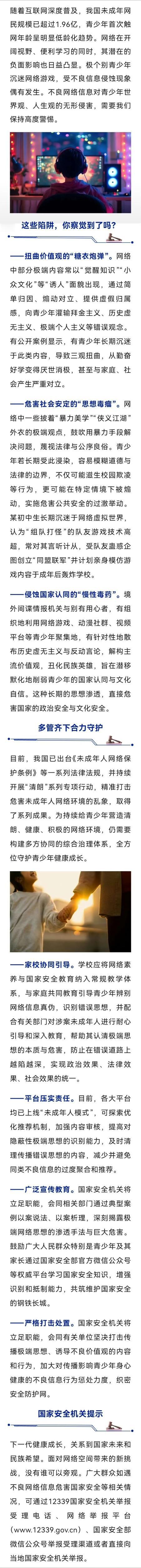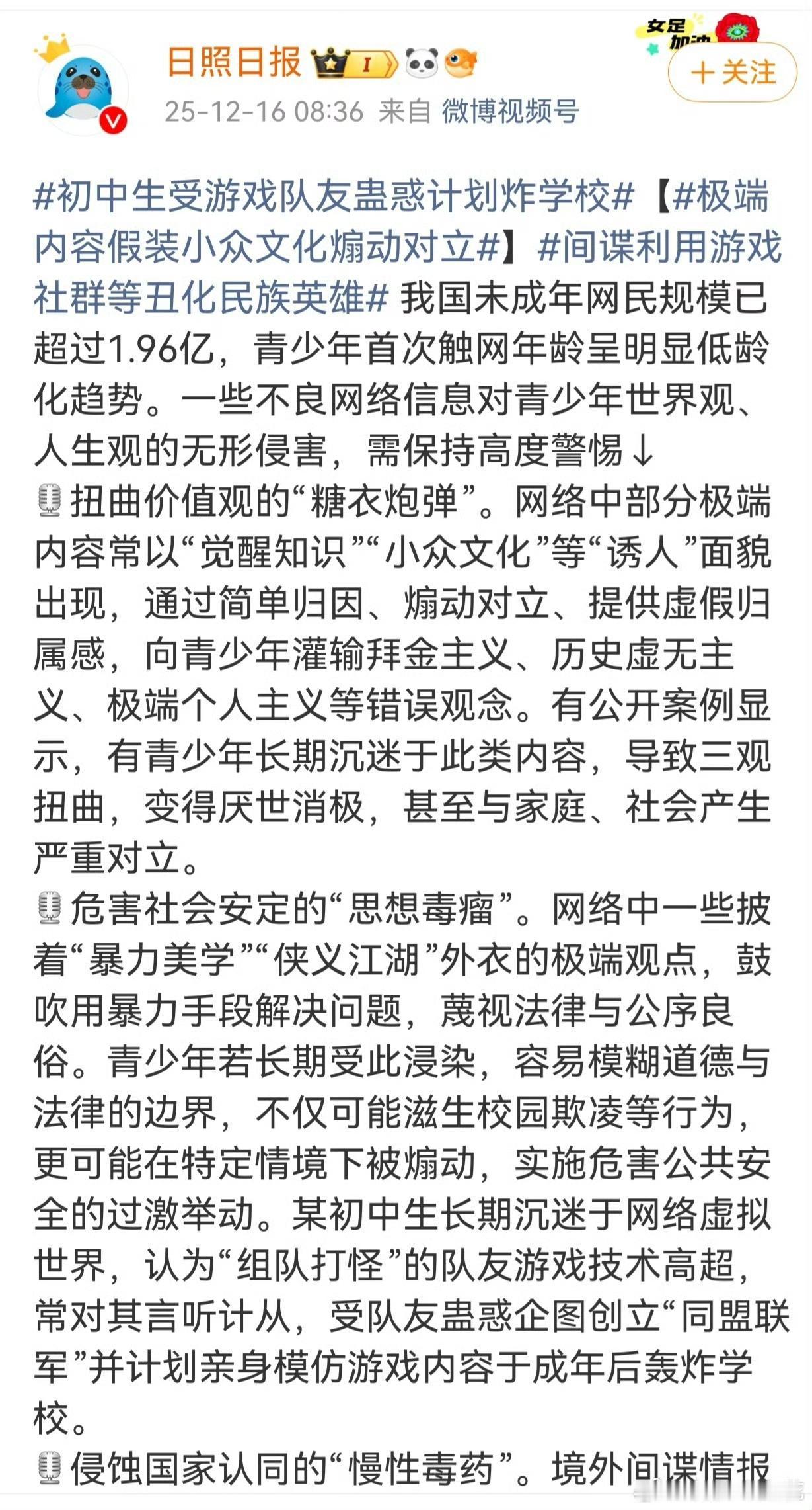 青少年受网络荼毒太深了,初中生受队友蛊惑想模仿游戏炸学校! 某初中生因长期沉迷网络游戏,对游戏中“技术高超”的队友言听计从,受其蛊惑计划创立“同盟联军”,并意图在成年后模仿游戏内容“轰炸学校”。 青少年时期本就是三观塑造的关键阶段,他们对虚拟与现实的边界认知模糊,对他人的蛊惑缺乏辨别能力。而网络游戏里的暴力情节、玩家之间的极端言论,就像一颗颗毒种子,在他们尚未成熟的心田里生根发芽。更可怕的是,一些别有用心的人,正借着游戏社交的外衣,向心智未开的孩子灌输危险思想,把他们推向违法犯罪的边缘。 这起事件绝非个例,它是一记响亮的警钟,敲醒了每一个忽视未成年人网络保护的人。 家庭是第一道防线。家长不能只盯着孩子的成绩单,更要关注他们的屏幕时间和网络社交。放下自己的手机,陪孩子去打球、去看书,用真实的陪伴填满他们的课余生活;主动和孩子聊一聊游戏里的故事,及时发现他们思想里的危险苗头,而不是等到问题爆发才追悔莫及。 学校不能缺席这场守护战。网络素养课、法治教育课不能只是走过场,要真正让孩子明白,网络不是法外之地,暴力言论和犯罪念头,从萌生的那一刻起就触碰了法律红线。老师们要多留意学生的课堂状态和日常言行,对沉迷网游、行为异常的孩子及时干预疏导,把隐患掐灭在萌芽状态。 平台更要扛起主体责任。未成年人模式不能是形同虚设的“摆设”,时长限制、内容过滤必须落到实处。对于游戏中涉及暴力、极端主义的聊天内容和游戏情节,要加大审核力度,发现一起查处一起。别让游戏平台,沦为滋生犯罪思想的温床。 少年强则国强,未成年人的健康成长,关乎着千家万户的幸福,更关乎着国家的未来。守护未成年人的网络净土,需要家庭、学校、平台三方携手,织密一张防护网,让孩子们在清朗的网络环境里,向阳生长。