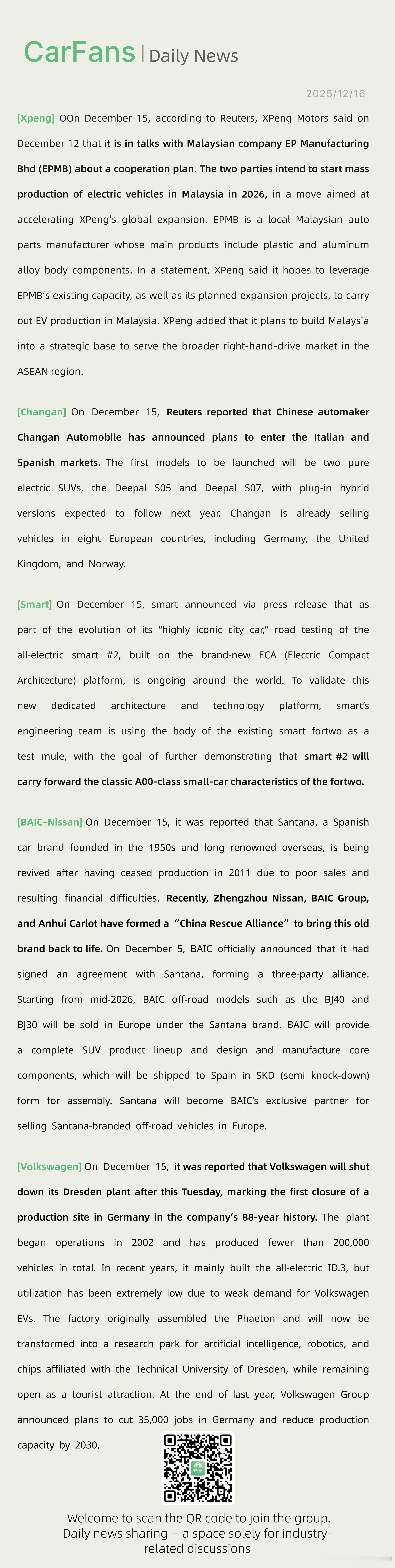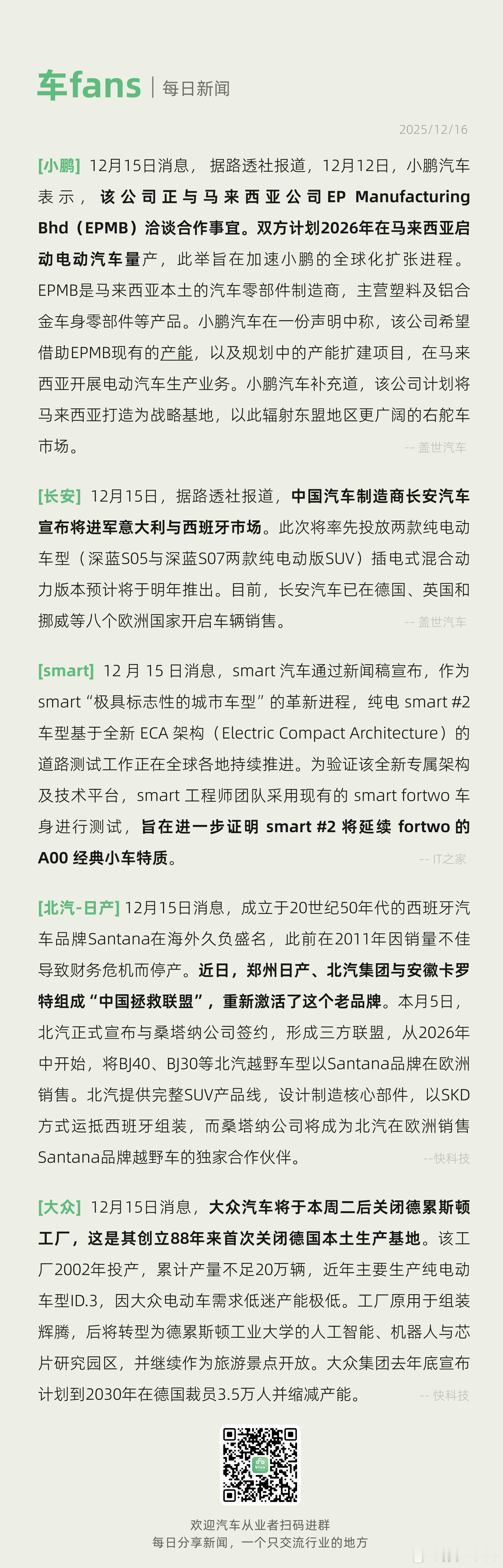 小鹏与马来西亚EPMB合作计划26年启动电车量产、大众本周二关闭德累斯顿工厂12月15日消息,据路透社报道,12月12日,小鹏汽车表示,该公司正与马来西亚公司EPManufacturingBhd(EPMB)洽谈合作事宜。双方计划2026年在马来西亚启动电动汽车量产,此举旨在加速小鹏的全球化扩张进程EPMB是马来西亚本土的汽车零部件制造商,主营塑料及铝合金车身零部件等产品。小鹏汽车在一份声明中称,该公司希望借助EPMB现有的产能,以及规划中的产能扩建项目,在马来西亚开展电动汽车生产业务。小鹏汽车补充道,该公司计划将马来西亚打造为战略基地,以此辐射东盟地区更广阔的右舵车市场。近期的新闻10条有8条跟海外相关,进度很快了新能源汽车
