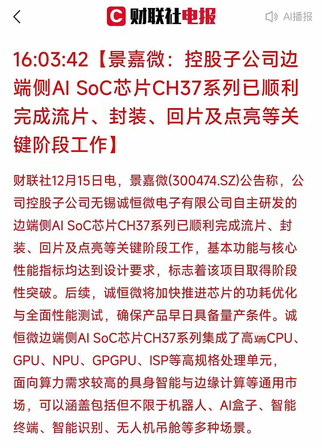 意外惊喜来了!国产高性能AI芯片取得又一重磅突破,景嘉微宣布了,旗下边端侧AI芯片CH37系列已经完成了量产前的关键准备工作,离成功商业化只有一步之遥了!据资料,这款芯片集合了多种处理单元,可以适应多种复杂任务,拥有强大的算力,广泛应用于机器人、云端边缘计算还有无人机智能识别等,总的来说利好国产算力替代!这款芯片对标的是国内外大厂,如英伟达的Jetson系列,华为的昇腾系列,虽然不能说绝对领先,但其性能属于中高端水平,足以满足大部分复杂任务需求!可能很多人会不理解甚至嘲笑,觉得一款还没量产的芯片也拿来吹。事实上就是芯片整个产业链是非常庞大的,需要全世界协同。而我们现在只能走国产自主替代这条路,每个环节的进步都是值得尊重的!