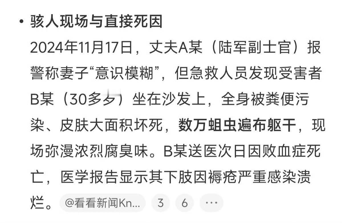 韩国惊现骇人家庭悲剧:妻子骨折生蛆被弃3月死亡,丈夫辩称“她不肯去医院”遭铁证打脸 2024年11月的韩国,一则骇人听闻的家庭悲剧震惊全网。一名韩国陆军副士官的妻子,在长达3个月的时间里被放任不管,最终浑身爬满蛆虫、皮肤坏死,因败血症悲惨离世。而这一切的背后,是丈夫的冷漠与谎言。 去年8月起,该女子因恐慌障碍和抑郁症行动不便,继而全身出现严重褥疮。 但她的丈夫,一名30多岁的陆军副士官,却对妻子的惨状视若无睹。在近3个月的时间里,既不送医,也未给予任何有效照护。 直到去年11月17日上午,丈夫才拨打119报警,称“妻子意识模糊”。可当急救队员赶到现场时,眼前的景象让他们不寒而栗:女子全身被粪便污染,数以万计的蛆虫遍布全身,甚至在救援人员到达时仍在排便。尽管被紧急送医,她还是在次日因败血症死亡。 面对调查,丈夫竟辩称是“妻子固执不肯去医院”。然而,一系列铁证却狠狠打了他的脸。 调查发现,在妻子状况急剧恶化的时段,家中自来水用量异常飙升,一个月超40吨。 更关键的是,死者生前曾写信哀求丈夫“带我去医院”,且其部分皮肤坏死并非单纯由褥疮导致,这些都与丈夫的说法形成强烈冲突。 更令人气愤的是,在妻子遭受如此痛苦时,丈夫却仍能泰然自若地与妻子家人交谈,过着看似平常的生活。 目前,该丈夫因涉嫌遗弃致死已被逮捕,并移交军事检察院。 法律专家分析,结合急救队员的证词、医学证据以及家中异常的生活数据,本案证据链十分有力,嫌疑人很可能面临5至10年的严厉刑期。 这起悲剧不仅暴露了当事人的人性之恶,也引发了社会对特殊疾病患者家庭照护、法律监管等方面的深刻反思。家庭悲剧 丧礼悲剧 韩国丧葬 家庭惨事 韩国✈️事故 韩国惨案 韩国家属 婚前离奇死亡 信息来源:看看新闻