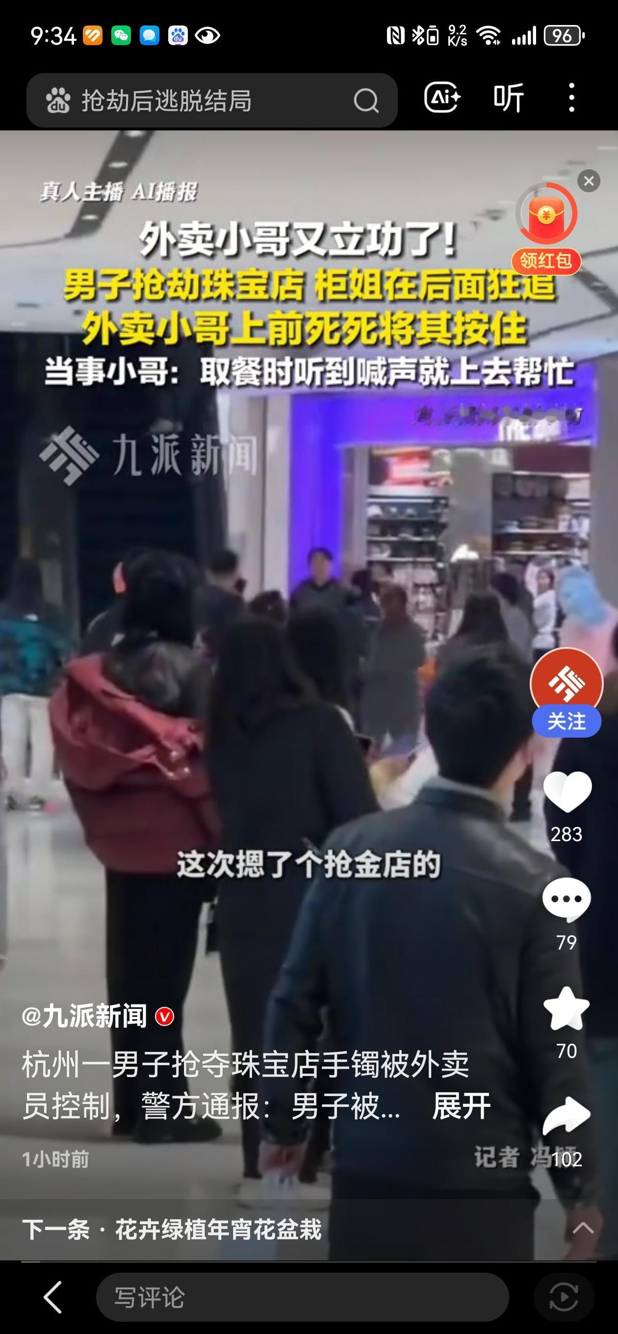 杭州一男子抢夺珠宝店手镯被外卖员控制,警方通报:男子被刑事传唤,外卖员系见义勇为