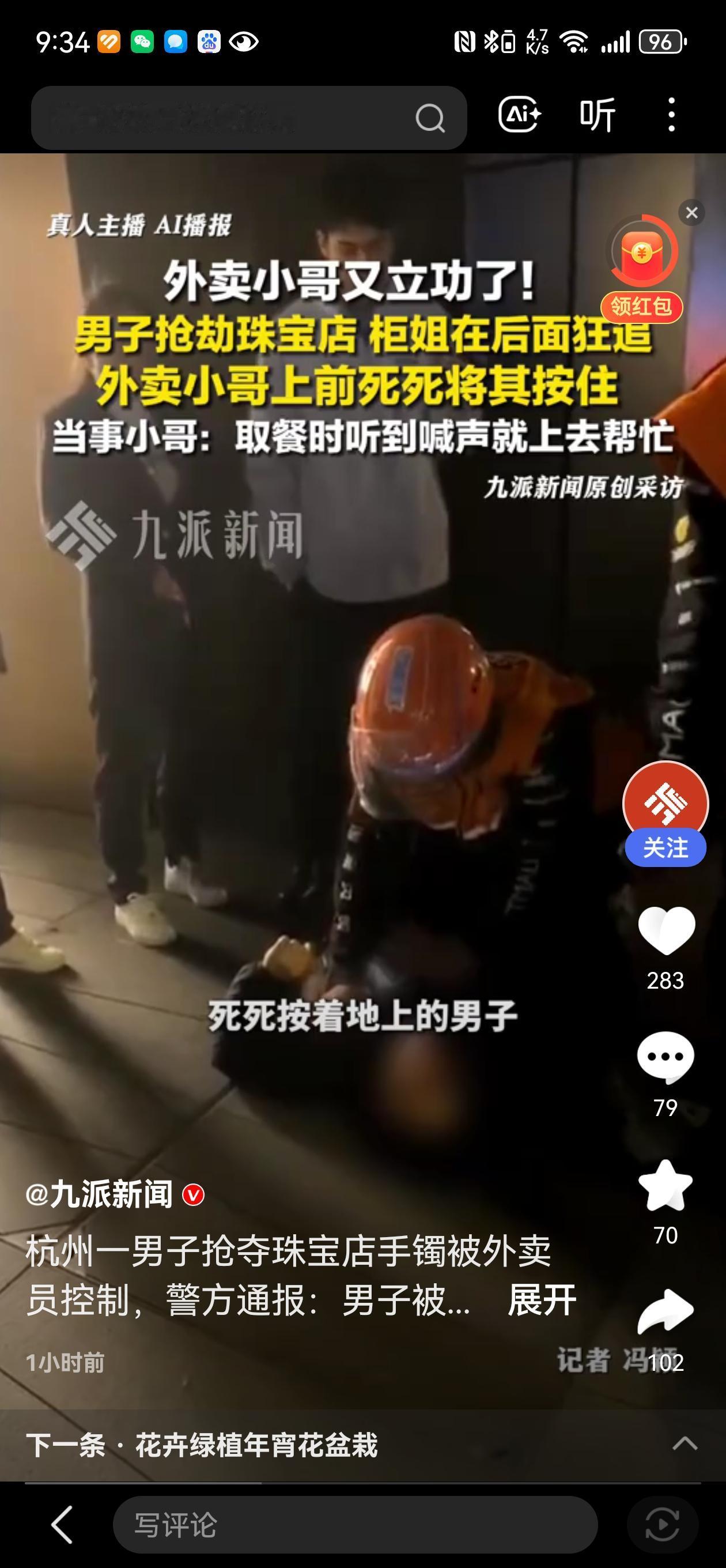 杭州一男子抢夺珠宝店手镯被外卖员控制,警方通报:男子被刑事传唤,外卖员系见义勇为。 一场突如其来的“英雄救美”故事,在杭州的繁华街头上演得淋漓尽致。男子冲进珠宝店,试图抢夺一只价值不菲的手镯,现场瞬间变成了紧张的“追逐战”。令人惊讶的是,正是在危急关头,一名外卖员挺身而出,用自己的行动阻止了这场可能的悲剧。 这位外卖员没有犹豫,没有退缩,只凭一腔正义感,将试图逃跑的男子制服在地。警方通报显示,男子已被刑事传唤,等待他的将是法律的严惩。而这名“见义勇为”的外卖员,也成为了当下社会热议的焦点:在危难时刻,是勇敢站出来的你,还是选择了旁观? 这个故事的背后,隐藏着深刻的人性光辉。我们常常在繁忙的生活中忽略了身边的“英雄”,他们或许是默默无闻的快递员、外卖员,也可能是平凡的邻居、路人。正是这些普通人,用行动诠释了“见义勇为”的真正意义——在危难时刻挺身而出,守护他人,彰显善良与勇气。 然而,令人扼腕的是,警方也提醒我们,任何非专业的“英雄行为”都可能带来风险。男子虽被控制,但事件也提醒我们:面对突发事件,安全第一,法律最公正。社会需要更多的正能量,但更需要理性与法治的引导。外卖员的勇敢无畏,值得点赞,但也希望未来每个人都能在保护自己和他人的同时,遵守法律、理性应对。 这个故事让人感受到一股暖流,也引发了对“善良与勇气”的深层思考。在这个快节奏、充满诱惑的时代,谁还能在危难时刻挺身而出?我们是否也能像那位外卖员一样,用行动点亮这个世界的某个角落?也许,正是这些普通人的“英雄时刻”,才让我们坚信:善良从未远离,它一直都在我们身边,只等待被点燃。 所以,下次当你路过街头,看到有人需要帮助,别犹豫。也许你我都可以成为那个“英雄”,在平凡中书写不平凡的故事。因为,真正的勇气,不是没有恐惧,而是在恐惧中依然选择站出来。