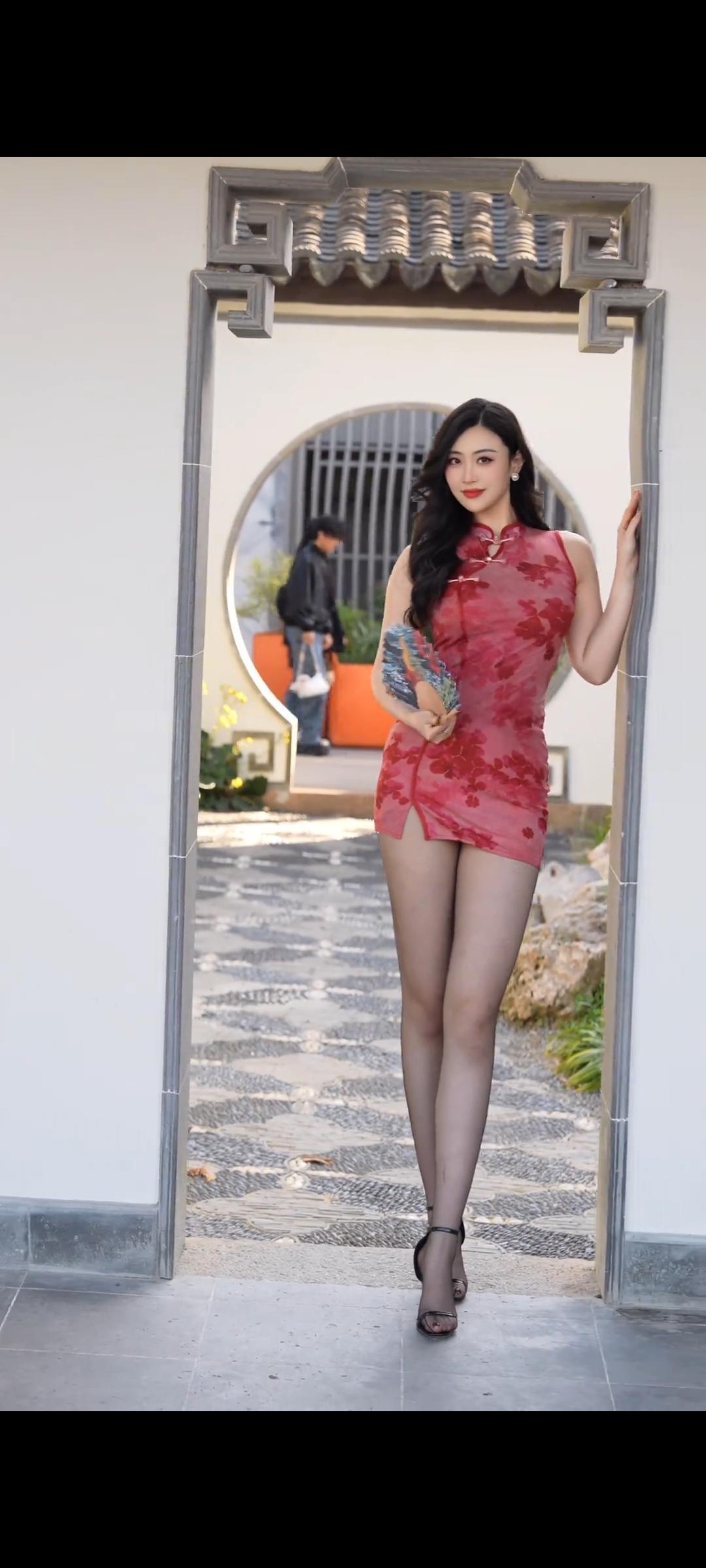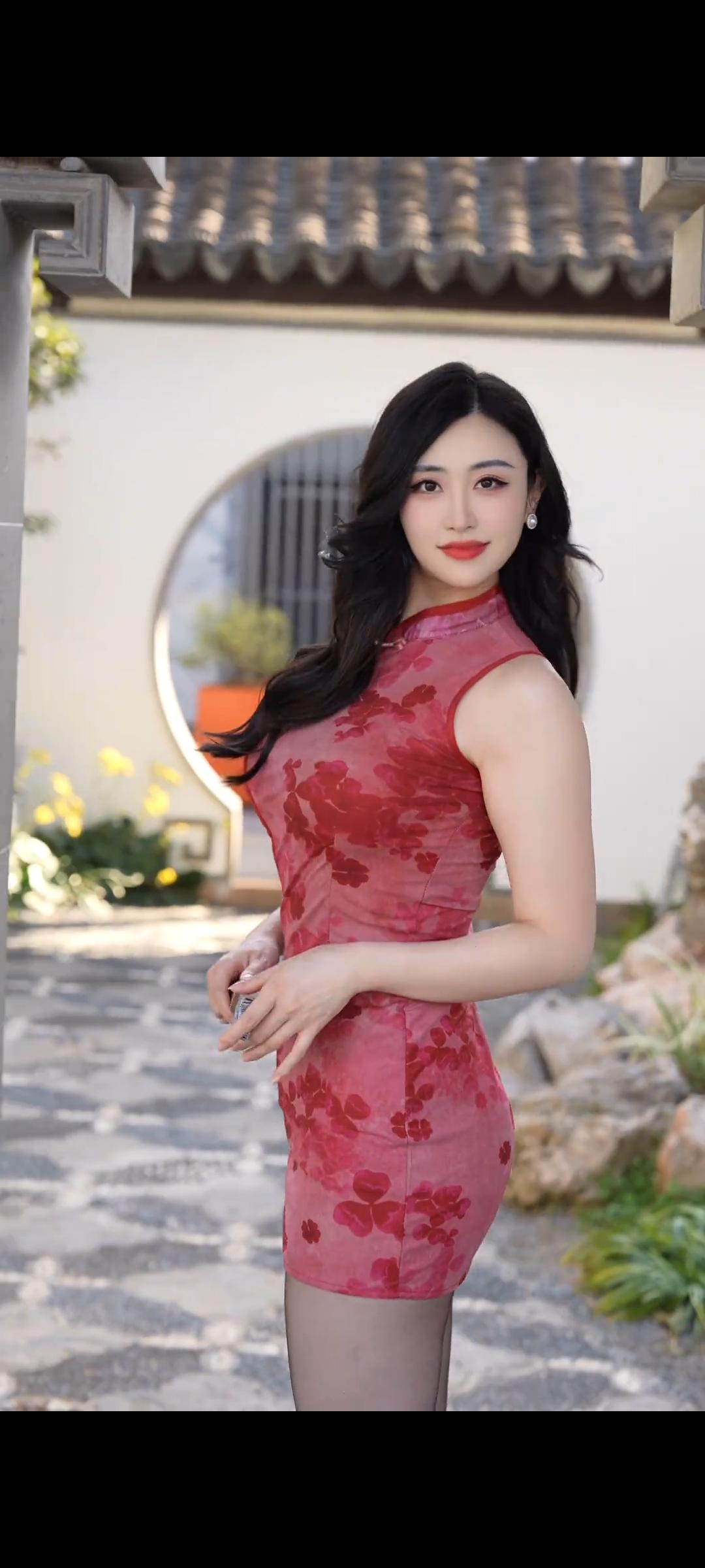 一袭红襟旗袍,邂逅江南园林意。 短款无袖红纹旗袍是核心亮点,修身裁剪贴合身材,勾勒出曼妙曲线;红色底纹搭配花卉图案,既保留旗袍的东方古典底蕴,短款设计又融入了现代性感元素,无袖款式更添利落与妩媚。 黑丝与黑色高跟凉鞋的组合,中和了旗袍的温婉,又增添了成熟妩媚的质感;手持的国风折扇,与园林场景,旗袍风格形成呼应,让造型的国风氛围感更完整;耳饰的点缀则提升了造型的精致度,细节处尽显用心。 江南园林的白墙,圆门,木柱等中式元素,与旗袍的东方美学完美契合,红裙在素雅的园林背景中形成视觉焦点,古典韵味意浓。