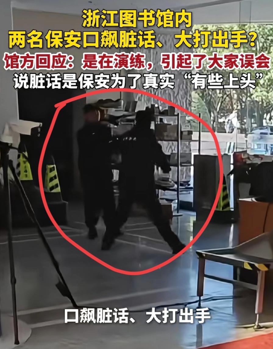 浙江图书馆两名保安互撕,又骂又打!馆方回应,误会!在演练!为了真实效果“有些上头”!可见,这俩保安演得太逼真了,这演技,当保安太屈才了,转行专业演员,成明星、拿影帝,分分钟几十万,在一个事业单位,聘用制保安,一个月才多少钱?!