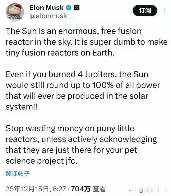 马斯克:地球上建小型聚变反应堆愚蠢至极,太阳贡献近100%能量!搞这些不过是为了满足你自娱自乐的科研项目 马斯克这话一出口,直接把全球聚变科研圈架在了火上。12月15日他在社交平台X上的犀利表态,看似站在“能源效率”的制高点,实则藏着明显的利益偏向——就在两个月前,特斯拉刚宣布重启纽约超级工厂的太阳能电池板生产,首批产品预计2026年一季度交付,而此前公司光伏业务曾跌至谷底,甚至停更相关数据。他反复强调“天空已有免费的巨大聚变反应堆(太阳)”,却刻意回避了一个关键问题:太阳能真能覆盖人类所有能源需求吗? 答案显然是否定的。马斯克曾说100英里见方的太阳能板就能满足全美国用电,但他没说的是,太阳能的间歇性是天生短板。北方寒冬积雪覆盖电池板,夜晚完全没有光照,就算钠离子电池循环寿命已突破6000次,低温环境放电效率仍会打折,而熔盐储能、压缩空气储能等技术虽在升级,却受地理条件、建设周期限制,难以实现全域无缝覆盖。更别说深海探测、极地科考、太空长期驻留这些场景,太阳能要么无法抵达,要么补给成本高到离谱,此时聚变能的稳定输出优势,是任何可再生能源都无法替代的。 科研人员耗费数十年攻关聚变技术,根本不是“自娱自乐”。中国合肥的“东方超环”EAST今年刚刷新纪录,实现1亿摄氏度1066秒稳态长脉冲运行,这项突破背后是200多项自主创新核心技术的积累。正在建设的BEST紧凑型聚变装置,目标直指20-200兆瓦聚变功率,要实现“产出能量大于消耗能量”的关键跨越,为商业化发电铺路。这些研究早已跳出实验室,衍生出的超导质子治疗系统能精准打击肿瘤,太赫兹安检仪已应用于地铁站,合肥更是集聚了近60家聚变相关企业,形成百亿元级产业规模。 马斯克的观点,本质上是用单一能源解决方案否定多元探索。他大力推广太空太阳能卫星计划,宣称“太空永远阳光充足,无需玻璃框架更便宜”,却忽略了地面聚变研究的溢出价值。ITER国际热核实验堆由30多个国家联合推进,中国、欧盟、美国各自布局不同技术路线,正是这种多路径并行,才让聚变商业化的时间表不断提前。中国计划2030年代建成CFETR示范堆,美国私营企业融资超97亿美元,这些投入都在印证,聚变能不是“愚蠢的尝试”,而是人类应对能源危机的重要后手。 更值得玩味的是,马斯克自己的太空探索事业,其实也离不开聚变技术的潜在支撑。他设想的星际航行、火星殖民,若依赖太阳能,远距离传输和储能都是致命难题,而小型聚变反应堆恰恰是解决长距离太空旅行能源供应的最优解之一。一边唱衰地面聚变研究,一边布局太空能源,这种矛盾背后,或许是特斯拉光伏业务的现实考量——毕竟唱衰竞争对手,能为自家太阳能产品争取更多市场空间。 聚变研究的价值,从来不止于发电。从超导材料的突破到精密制造的升级,从等离子体物理的深化到医疗技术的革新,每一步进展都在推动相关产业迭代。合肥市聚变产业联合会已联结200余家会员企业,覆盖超导材料、磁体系统等十大环节,这种“科研-产业”的良性循环,是任何单一能源技术都难以带动的。马斯克只看到了聚变研究的短期投入,却忽视了其长远的科技赋能效应。 能源转型的终极目标,是构建多元、稳定、清洁的供给体系。太阳能、风能是重要组成部分,聚变能则是关键补充,二者不是对立关系,而是互补关系。科研人员从未否定太阳能的价值,反而在探索“聚变+可再生能源”的组合模式,既利用可再生能源的环保优势,又靠聚变能兜底供电稳定性。马斯克的犀利言论或许能吸引流量,但无法改变一个事实:重大科技突破从来不是靠“否定他人”实现的,而是靠脚踏实地的探索与坚持。 人类文明的进步,正是源于对“不可能”的挑战。从钻木取火到电力革命,每一次能源迭代都伴随着质疑与争议。聚变能的商业化或许还需要时间,但那些为了“人造太阳”默默攻关的科研人员,那些为了突破核心技术日夜奋战的工程师,他们的努力值得尊重。毕竟,真正的创新从来不是孤注一掷押注某条路线,而是在开放包容中寻找最优解。需要我整理中国BEST装置和马斯克太空太阳能计划的核心数据对比吗? 各位读者你们怎么看?欢迎在评论区讨论。