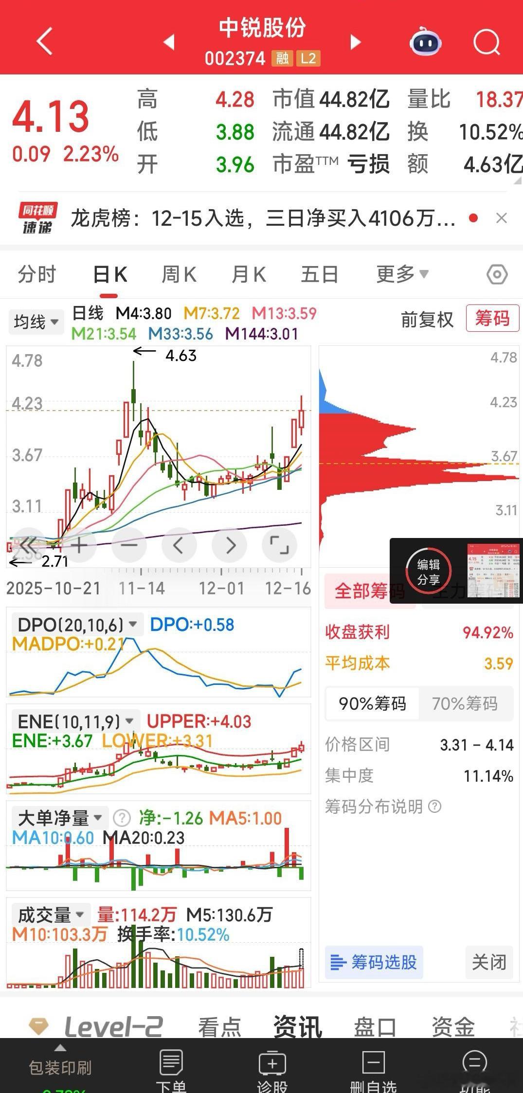 【应邀再战一票:4.13元建仓中锐股份。】4.13元建仓中锐股份。