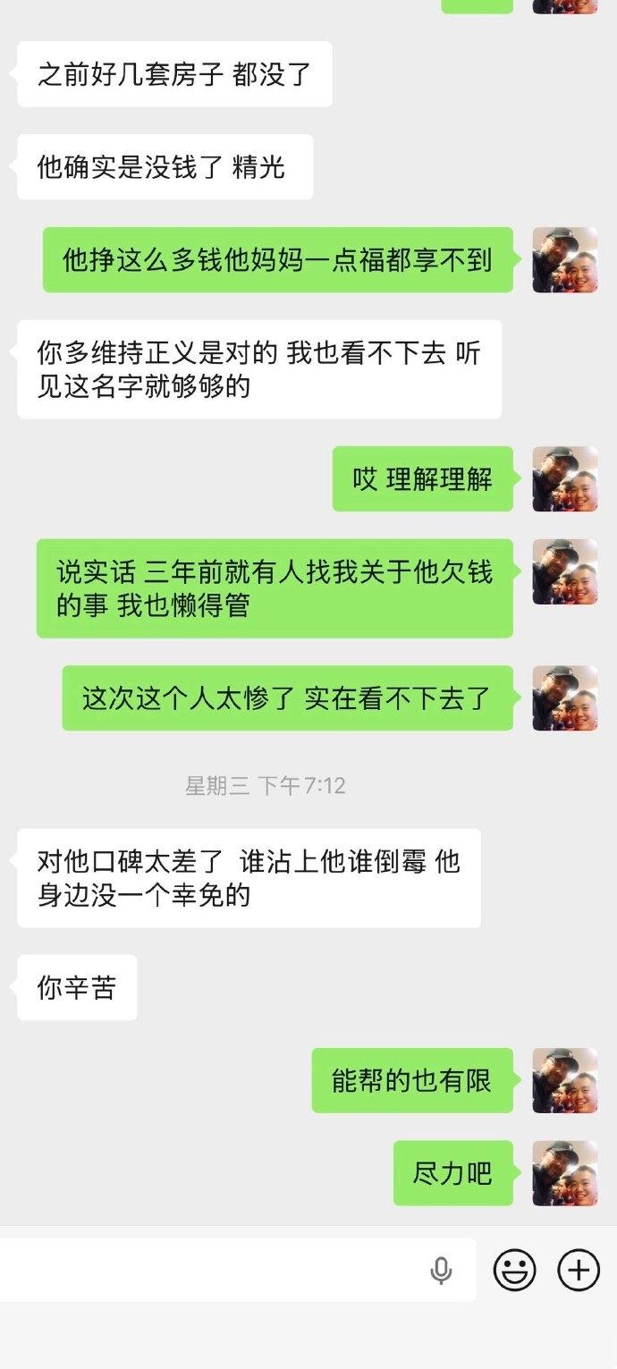 李平康晒出了多张聊天截图表示:据戴琳曾经身边朋友介绍,戴琳对他的母亲也是经常进行辱骂,他的母亲为了帮他还债,也借了不少钱,还外出打工。有个曾经年收入数百万的儿子,一把年纪了还要打工还债,甚至遭受辱骂虐待,也是挺让人唏嘘的。我有一个建议,恳请大家不要骂戴琳的母亲了,虽然有教子无方之责,但也是很让人同情了!