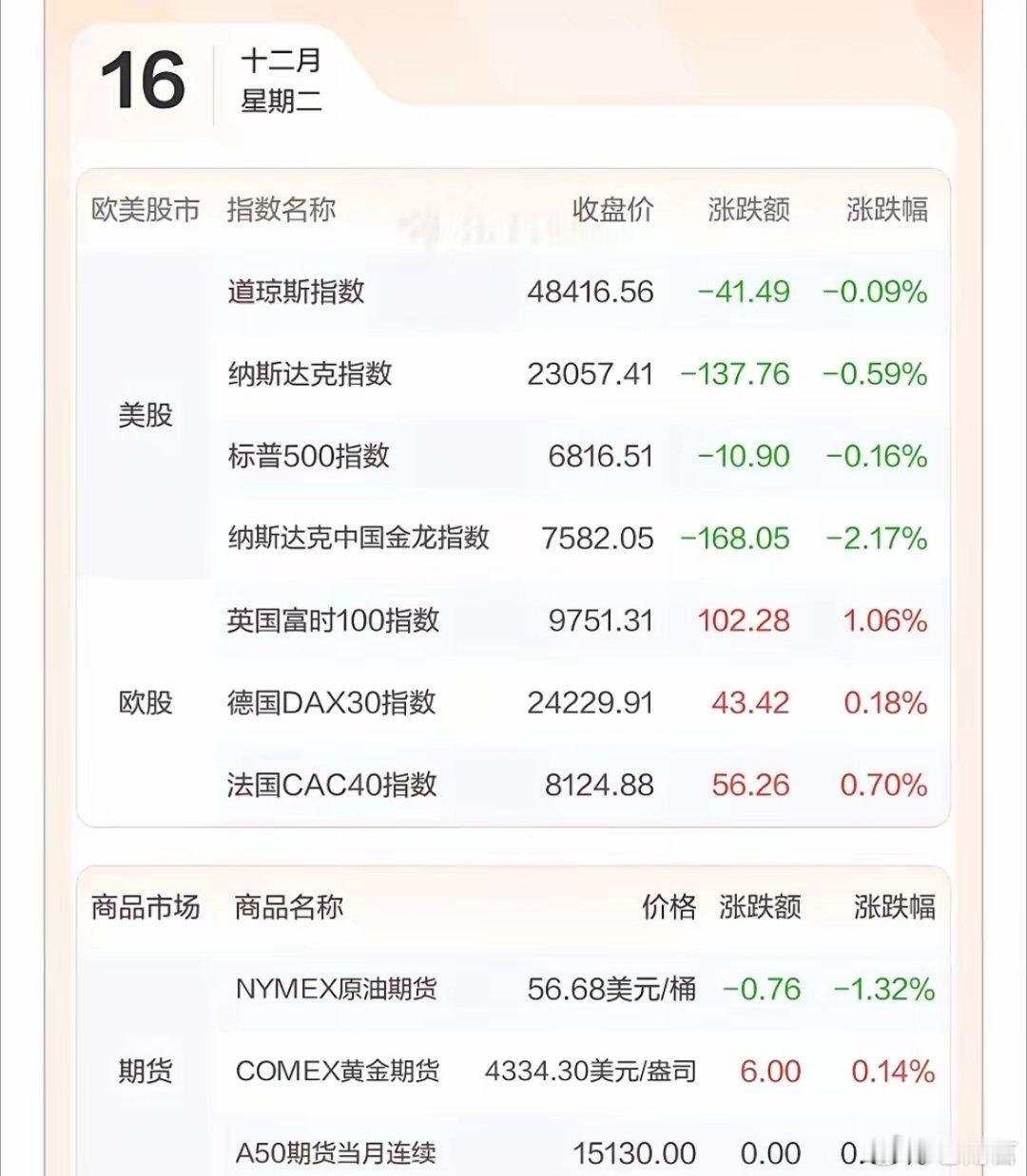 纳斯达克申请延长交易时长至23小时纳斯达克称申请将工作日交易时长延长至23小时 纳斯达克称将于周一向美国证券交易委员会提交文件,申请推出近乎全天候的股票交易,将股票及交易所交易产品的交易时长从每周五个交易日的16小时延长至23小时。目前,纳斯达克在工作日设有三个交易时段:美国东部时间凌晨4点至上午9点30分的盘前交易时段、上午9点30分至下午4点的常规交易时段,以及下午4点至晚上8点的盘后交易时段 美股三大指数12月15日收盘全线下跌。截至收盘,道琼斯工业平均指数比前一交易日下跌41.49点,收于48416.56点,跌幅为0.09%;标准普尔500种股票指数下跌10.9点,收于6816.51点,跌幅为0.16%;纳斯达克综合指数下跌137.76点,收于23057.41点,跌幅为0.59%。 大型科技股多数下跌,博通跌超5%,苹果、亚马逊、美光科技跌超1%,特斯拉涨超3%创近一年新高,英伟达涨0.73%。 热门中概股普跌,纳斯达克中国金龙指数收跌2.17%。百度跌近5%,金山云跌超4%,知乎、阿里巴巴、小鹏汽车跌超3%,理想汽车、好未来跌超2%,名创优品涨超2%