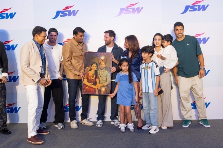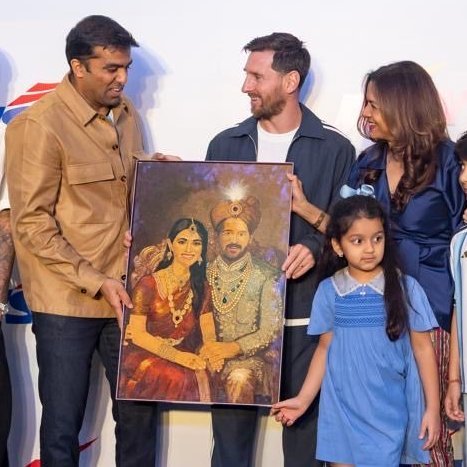 像吗?梅西在孟买参加活动,获赠自己和安东内拉的印度风格画像