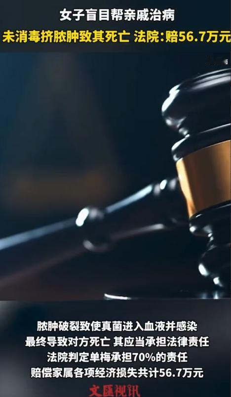 吉林临江,女子回老家探亲时,得知亲戚有腿疾,女子表示自己能治,经过一阵推拿揉搓,亲戚腿上出了个大脓肿,女子在没消毒的情况下挤破脓肿,导致亲戚血液感染,最终因多器官功能衰竭而亡。案发后亲戚家属不干了,先是报了警,后又起诉索赔。 2024年5月,吉林临江的一户人家被悲伤笼罩,中年男子王明因血液感染引发多器官功能衰竭离世,而这场悲剧的源头,竟是亲戚单梅一次出于“表现欲”的热心帮忙。 时间倒回当年春节,常年在外的单梅回到老家探亲,饭桌上家人聊起王明多年的腿疾。 得知王明被腿疾折磨得苦不堪言,四处求医却始终没能根治,一向爱出风头、喜欢在亲友面前“露一手”的单梅当场就接了话。 她压根没提自己毫无医学资质的事,反而拍着胸脯说自己做过按摩养生,对付这种老毛病有的是办法,主动提出要给王明治病。 单梅的热情和“打包票”的态度,让被病痛折磨许久的王明动了心。 他没多想单梅是否具备治病的能力,只觉得是亲戚不会坑自己,抱着试试看的心态,在4月中旬专门赶到单梅位于临江的住处,接受所谓的“治疗”。 单梅的治疗过程简单又粗暴,没有任何前期检查,也没有专业的诊疗方案,全程就是用手和脚对着王明的腿部反复撵压、滚动揉搓,力道大得让王明好几次都觉得不适。 可单梅一直说这是“通经络、排寒气”的必要过程,让他再坚持坚持。 坚持了没几天,王明的右脚脚背就肿了起来,慢慢形成了一个明显的脓肿,按压时还伴随着剧烈疼痛。 王明心里发怵,找单梅询问情况,得到的却是“好事”的答复,说这是腿里的“毒素”要排出来的征兆,脓肿就是毒素的出口,等脓挤出来,腿疾就能彻底好。 被这番话误导的王明,继续任由单梅操作,过了几天,单梅见脓肿成熟,没做任何消毒准备,也没使用无菌器具,就用手直接将王明脚背上的脓肿挤破。 脓液流出后,单梅还得意地说这下就没事了,让王明回去等着恢复。 可回去没几天,王明就开始持续发烧,浑身乏力,腿部的疼痛感也越来越剧烈。 家人赶紧带他去医院检查,医生诊断后发现是伤口感染引发的全身性症状,已经出现了血液感染的迹象。 尽管医院全力抢救,王明的病情还是在短短一个月内迅速恶化,到了5月17日晚上,王明还是没能抢救回来。 亲人的突然离世,让王明家属悲痛万分,他们第一时间找到单梅,希望能私下协商解决此事。 协商无果后,王明家属选择报警,控诉单梅非法行医致人死亡。 警方经过调查后认为,单梅的行为没有以盈利为目的,不构成刑事犯罪,最终作出了不予立案的决定,不死心的家属又提起民事诉讼。 法院审理期间,通过尸检报告确认,王明的死亡与单梅挤破脓肿的行为存在直接因果关系,未消毒的操作导致真菌侵入血液,引发严重感染,最终造成多器官衰竭。 法院认为,单梅无行医资质却擅自开展治疗,操作过程违反基本医疗常识,主观上存在重大过失,其行为已经构成侵权。 最终,法院判决单梅承担70%的主要责任,赔偿王明家属各项损失共计57.6万元。 拿到判决书的那一刻,单梅彻底崩溃,嚎啕大哭起来。 她原本只是想在亲戚面前“表现表现”,证明自己有能力,却没想到一时的逞强和无知,不仅害死了亲戚,还让自己背上了巨额债务,原本和睦的亲戚关系也彻底破裂。 这场悲剧的发生,并非偶然,背后折射出的社会现象值得每个人警惕。 现实生活中,像单梅这样的人不在少数,总觉得“热心”就能替代专业,凭着一腔热血就敢涉足自己完全不了解的领域,忽视了专业门槛和潜在风险。 尤其是医疗领域,关乎生命健康,每一个操作都需要专业知识和资质支撑,绝非“胆子大、热心肠”就能胜任。 同时,“熟人信任”的陷阱也在很多类似事件中存在。 不少人觉得亲戚、朋友帮忙更靠谱,往往会放松警惕,忽视了对方是否具备相应能力,最终酿成无法挽回的后果。 单梅的例子用血泪证明,没有资质的“热心帮忙”,不仅帮不了人,还可能酿成大祸。 对于每个人来说,不管是帮别人还是求别人帮忙,涉及专业领域尤其是医疗健康时,都要守住底线,尊重专业、相信科学,这才是对自己和他人生命健康最基本的负责