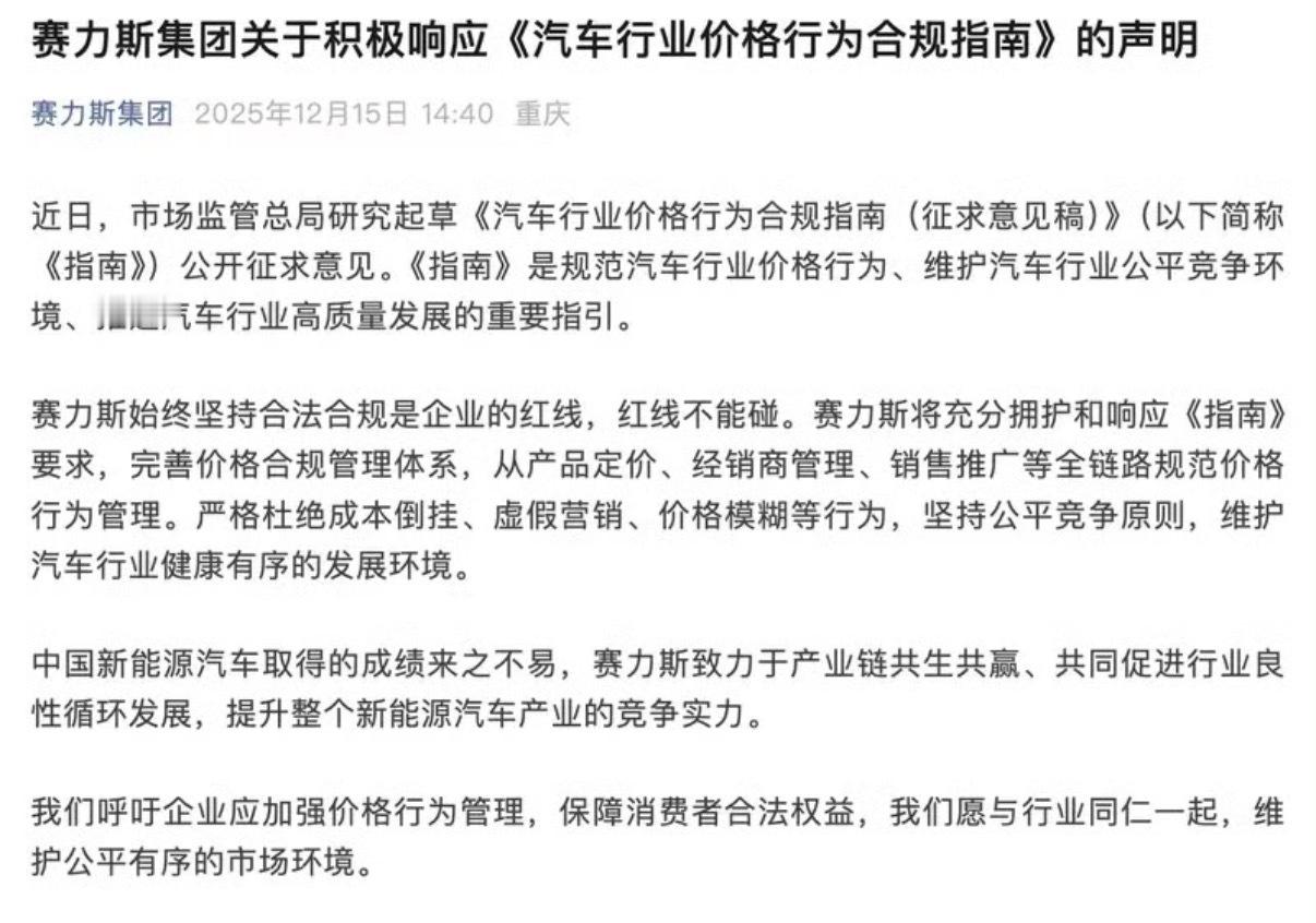 【赛力斯集团发布积极响应《汽车行业价格行为合规指南》声明】日前,市场监管总局研究起草《汽车行业价格行为合规指南(征求意见稿)》(以下简称《指南》)公开征求意见。《指南》是规范汽车行业价格行为、维护汽车行业公平竞争环境、推进汽车行业高质量发展的重要指引。赛力斯始终坚持合法合规是企业的红线,红线不能碰。赛力斯将充分拥护和响应《指南》要求,完善价格合规管理体系,从产品定价、经销商管理、销售推广等全链路规范价格行为管理。严格杜绝成本倒挂、虚假营销、价格模糊等行为,坚持公平竞争原则,维护汽车行业健康有序的发展环境。