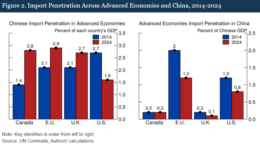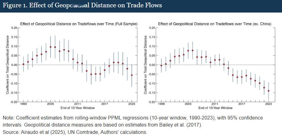 中国掩盖了全球贸易碎片化,在地缘政治导致的贸易分裂中起了非对称作用1. 美联储工作报告发现了中国对全球贸易碎片化的逆向作用。碎片化是说,地缘政治距离成为双边贸易流动日益重要的因素,这是很直接的观察,是对全球化的逆转,近年来成为贸易研究的热门。现象确实有不少,如美国搞近岸外包,多个区域经济集团加强内部经济协作,减少对外部依赖。在这个模式中,国家被分组成区块,区块内的贸易优先于区块间的贸易,有时“连接国”会在区块之间建立联系。2. 但是中国不符合这个叙事。实际发生的事是,即使离中国很远的地区,对中国的出口需求也大幅上升。图一是全球45个重要贸易国家的数据分析,红点在坐标轴上方,说明国家距离对于贸易是正面作用,在下方,说明距离是负面作用。图中显示,2005年以前,距离不影响贸易增长;之后距离对于贸易的作用是逐渐下降,但直到2022年俄乌冲突以后,距离影响才变成负的。但是,如果把中国排除掉,那从2014年起,距离对贸易的影响就是负的了,而且越来越严重,现在负挺多了。3. 这说明,除了中国,全球国家在调整贸易方式,多和近邻贸易。但由于中国体量很大,与全球非常远的国家也积极扩大贸易,很大程度上掩盖了全球贸易的碎片化。中国占全球出口的15%,一国而言非常多了,以一己之力将图表的下降趋势弄得不明显了。4. 需要注意,中国并非是墨西哥、越南这种“连接国”的概念。连接国不会改变趋势,只是区域之间的贸易从连接国走。但中国是真的和远在天边的国家都大搞贸易,有力扩大了全球远距离贸易的数量,如中国与巴西、阿根廷离得非常远,贸易规模却不小。5. 中国的问题是,虽然帮助了全球远距离贸易,但出口多、进口少,让依赖关系不对称。图二,几个发达经济体2014年与2024年与中国的进出口渗透率(占GDP的比例)。可以看出,除了美国表面上减少了中国进口,欧盟、英国、加拿大都增加了对中国的进口依赖;而中国对这些国家的进口却减少了。对全球也是这个现象,导致中国顺差大增,贸易不平衡。6. 中国更严重的问题是,在关键矿物质的加工上,占比太高。这导致其它国家依赖中国的加工能力,出口管制形成威慑。(这是美联储报告的说法)。7. 中国和距离很远的国家也大搞贸易这个现象,说明了全球化还是有正面作用,起码我国还是在大搞全球贸易,再远的国家来做生意都欢迎。美联储报告说地缘政治导致碎片化,那是loser思维,打不过就找安全原因本地抱团。赢家自然喜欢全球化,强大的公司会把生意做到全球。