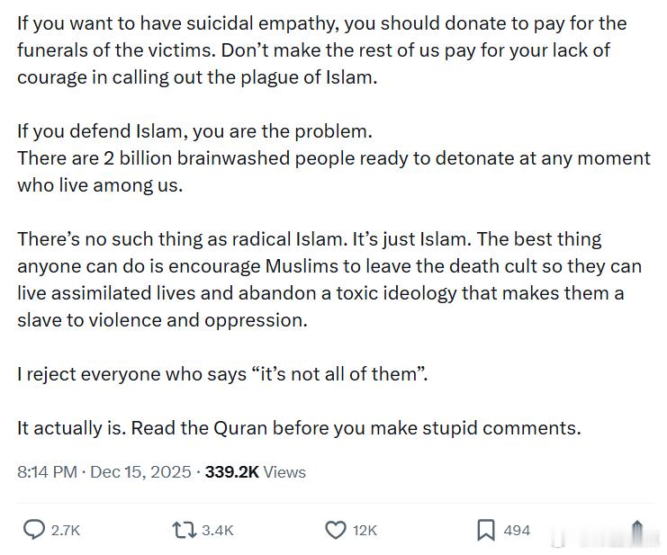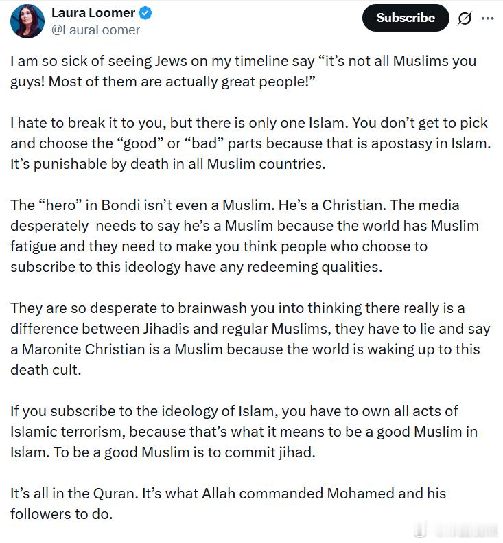 劳拉·卢默:我真是受够了在我的动态里看到犹太人说:“不是所有穆斯林都是这样的!他们大多数其实都是好人!”很抱歉打破你的幻想,但只有一种伊斯兰。你不能随意挑选“好”或“坏”的部分,因为那在伊斯兰教里就是叛教。在所有穆斯林国家,这都是死罪。邦迪事件中的“英雄”甚至不是穆斯林,他是基督徙。媒体拼命要说他是穆斯林,因为全世界都对穆斯林感到疲惫,他们想让你认为选择信奉这种意识形态的人还有什么可取之处。他们拼命想让你相信圣战者和普通穆斯林之间真的有区别,甚至不得不撒谎,说一位马龙派基督徙是穆斯林,因为全世界正在觉醒,认识到这是一个S亡崇拜。如果你信奉伊斯兰意识形态,你必须为所有伊斯兰恐布行为负责,因为这就是成为一个好穆斯林的意义。在伊斯兰教里,成为好穆斯林就是要进行圣战。这一切都在《古兰经》中。真猪命令穆罕默德和他的追随者去做这些事情。如果你想有自S式的同情心,你应该捐款支付受害者的葬礼费用。不要让我们其他人为你没有勇气揭露伊斯兰的祸害买单。如果你为伊斯兰辩护,你就是问题所在。有20亿被铣脑的人随时可能爆发,他们就生活在我们周围。根本不存在“激进伊斯兰”,这只是伊斯兰。任何人能做的最好的事情,就是鼓励穆斯林离开这个S亡崇拜,让他们能够融入社会生活,抛弃这种让他们成为暴力和压迫奴隶的有害意识型态。我拒绝所有说“不是所有人”的人。事实上,就是所有人。在你发表愚蠢评论之前,先读一读《古烂经》。