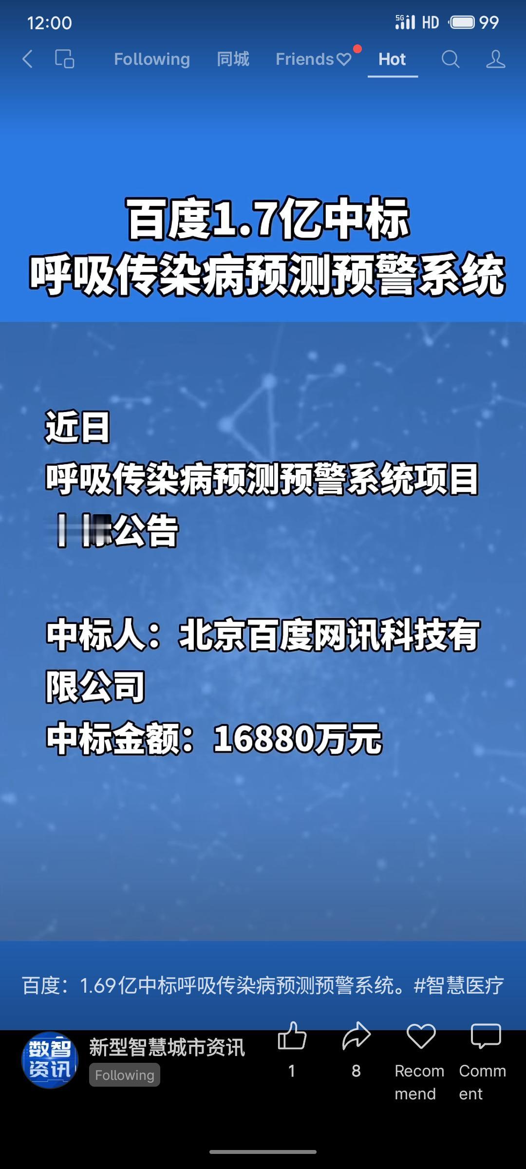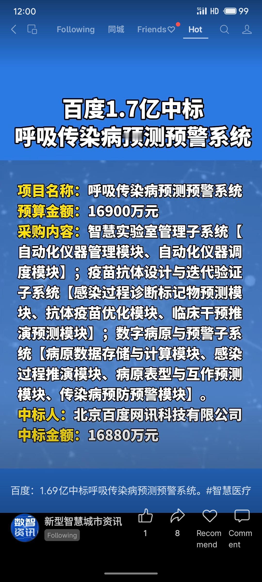 百度1.69亿元中标呼吸传染病预测预警系统项目,涵盖智慧实验室管理、疫苗抗体设计、数字病原与预警三大子系统,将用于传染病预测与防控。