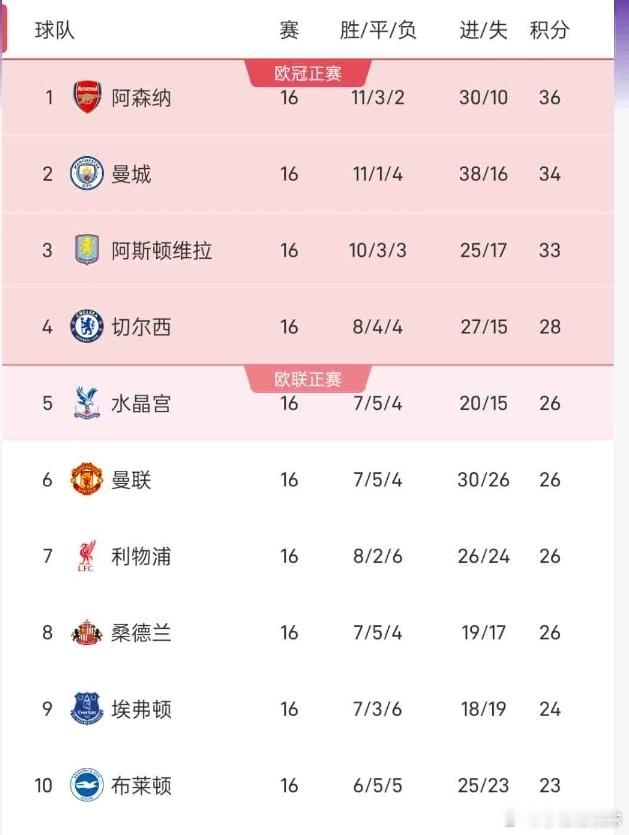 曼联vs伯恩茅斯英超最新积分榜:曼联红军分列6、7,枪手榜首领先曼城2分随着曼联主场4-4伯恩茅斯的比赛结束,英超16轮过后的实时积分榜也已出炉。阿森纳依旧领跑积分榜,领先第二名曼城2分;切尔西以28分排名第4;曼联、利物浦同以26分排名第6和第7。热刺则以22分排名11;而16轮比赛后,狼队仍以2平14负0胜的战绩积2分垫底。