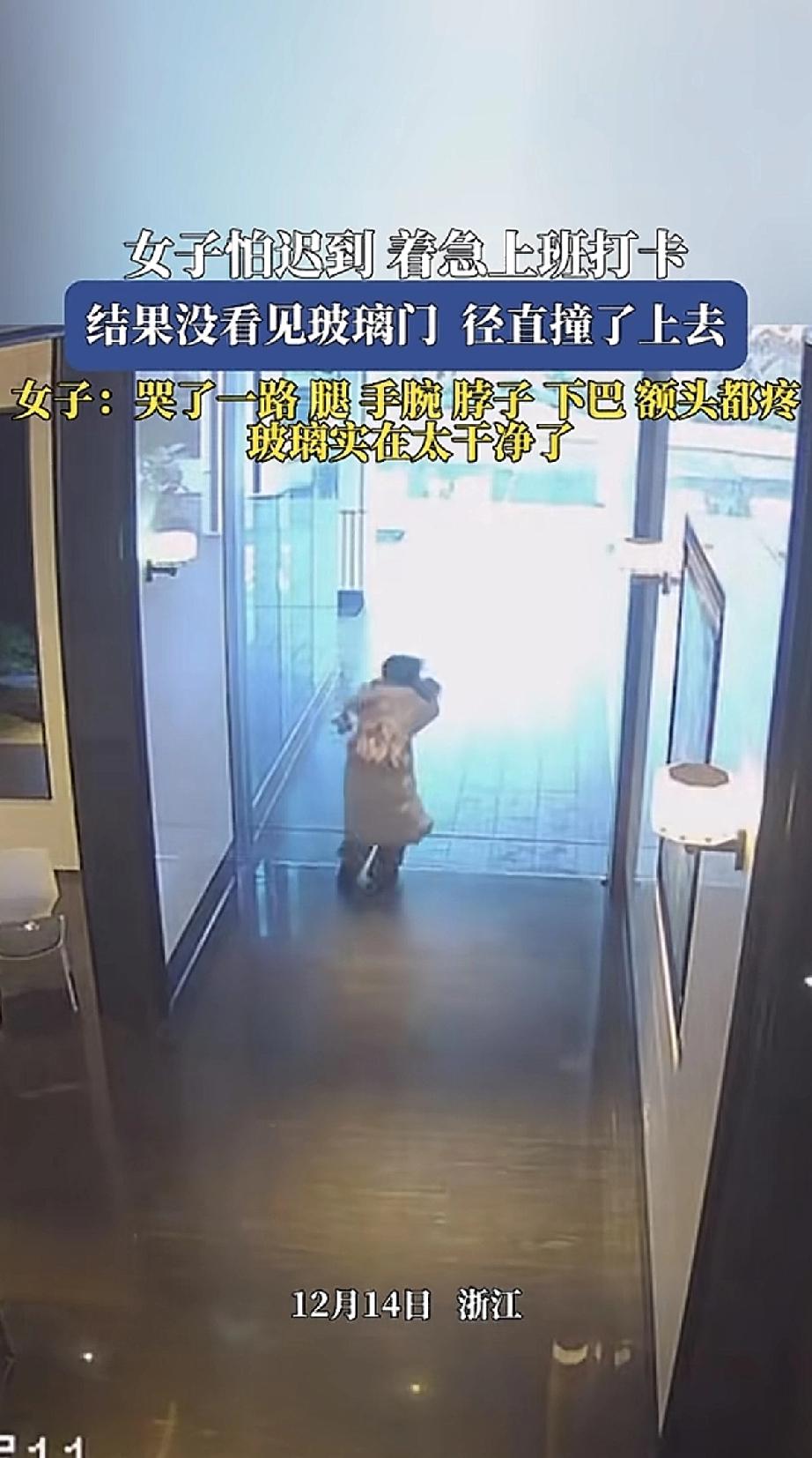 浙江一位女士上班怕迟到,一路小跑赶着打卡。结果一着急,没看见前面的玻璃门,径直“咣当”一声撞了上去。 这一下撞得结结实实,腿、手腕、脖子、下巴、额头……哪哪儿都疼。她后来说:“玻璃擦得太干净了,根本看不见!”又疼又委屈,哭了一路。 真是让人哭笑不得。上班族不容易,赶时间也得留神脚下眼前。这玻璃门也没标识和门把手,很难看出来。