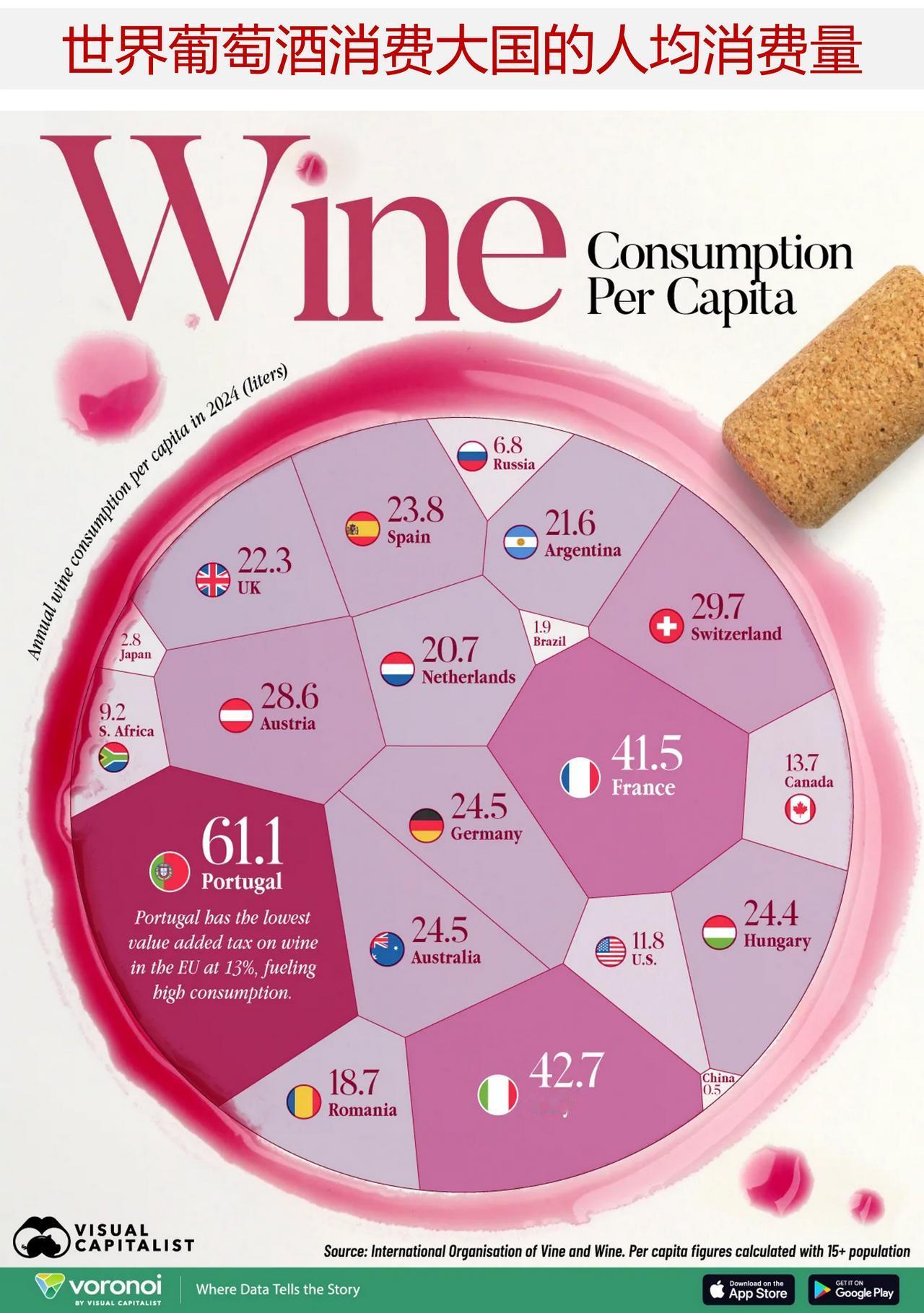 在世界葡萄酒消费大国,哪家的人均葡萄酒消费量最高? 葡萄酒是一种极具地域特色的饮品。在某些国家,它已成为日常饮食的一部分;而在其他一些国家,人们则更多地将其作为偶尔的消费选择。 下面图表展示了 2024 年这 20 个总体葡萄酒消费量最高的国家的人均葡萄酒消费量情况,数据来源于国际葡萄与葡萄酒组织,而人口(15 岁及以上)数据则来自世界银行。 这些差异十分显著,表明了“普通”葡萄酒消费情况会因观察的角度不同而产生巨大差异。 ——人均饮葡萄酒量最多的国家 2024 年,葡萄牙位居榜首,人均饮葡萄酒量为 61.1 升。这一数字比排名第二的意大利高出 18.4 升(42.7 升),比法国高出 19.6 升(41.5 升)。 葡萄牙人均葡萄酒产量高,且干红葡萄酒的增值税仅为 13%(在欧盟中处于最低水平),这些因素促使其葡萄酒消费量居高不下。 即便在葡萄牙,起泡酒需缴纳 23% 的增值税(且没有额外的酒精消费税),但在餐厅消费时,起泡酒的增值税则会降至 13%。 在所列出的 20 个国家中,人均饮葡萄酒量的平均值为 21.5 升,中位数为 22.0 升——这意味着有半数国家人均饮葡萄酒量高于(或低于)大约 20 多升这个数值。 ——欧洲国家人均葡萄酒消费量最高 在人均葡萄酒消费量方面,欧洲国家位居前列。总体而言,欧洲国家人均葡萄酒消费量为 28.7 升,远高于 20 个国家的平均消费量 21.5 升。 然而,在欧洲各国当中,也存在着明显的等级之分,排名前三的国家之后,差距就逐渐拉大了。 消费量从法国的 41.5 升下降至瑞士的 29.7 升,降幅达 11.8 升——这相当于美国人均消费量的总和(11.8 升)。 ——葡萄酒消费量在各地有所不同 该数据集中,欧洲国家与非欧洲国家的分别为28.7 升 和10.8 升——后者的人均葡萄酒消费量仅为前者的不到一半。但两者之间的差距相当大。 澳大利亚的人均葡萄酒消费量在非欧洲国家中表现突出,达到 24.5 升,而加拿大(13.7 升)和美国(11.8 升)则处于中等偏低的范围。 日本(2.8升)、巴西(1.9升)和中国(0.5升)的数据表明,在庞大的非传统市场中,人均消费量可能非常低。