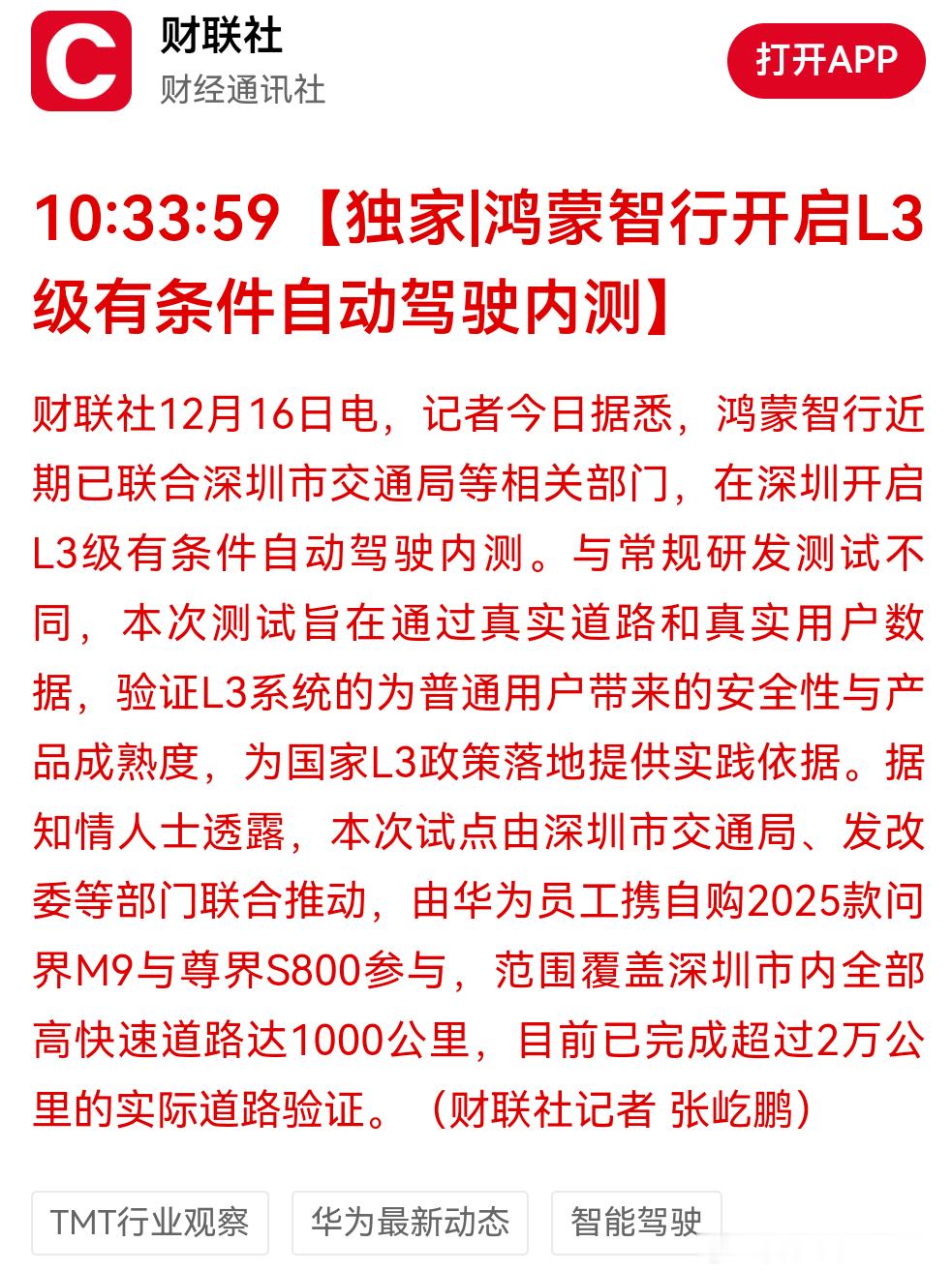 看给一些人急的……鸿蒙智行在深圳开启L3测试L3鸿蒙智行