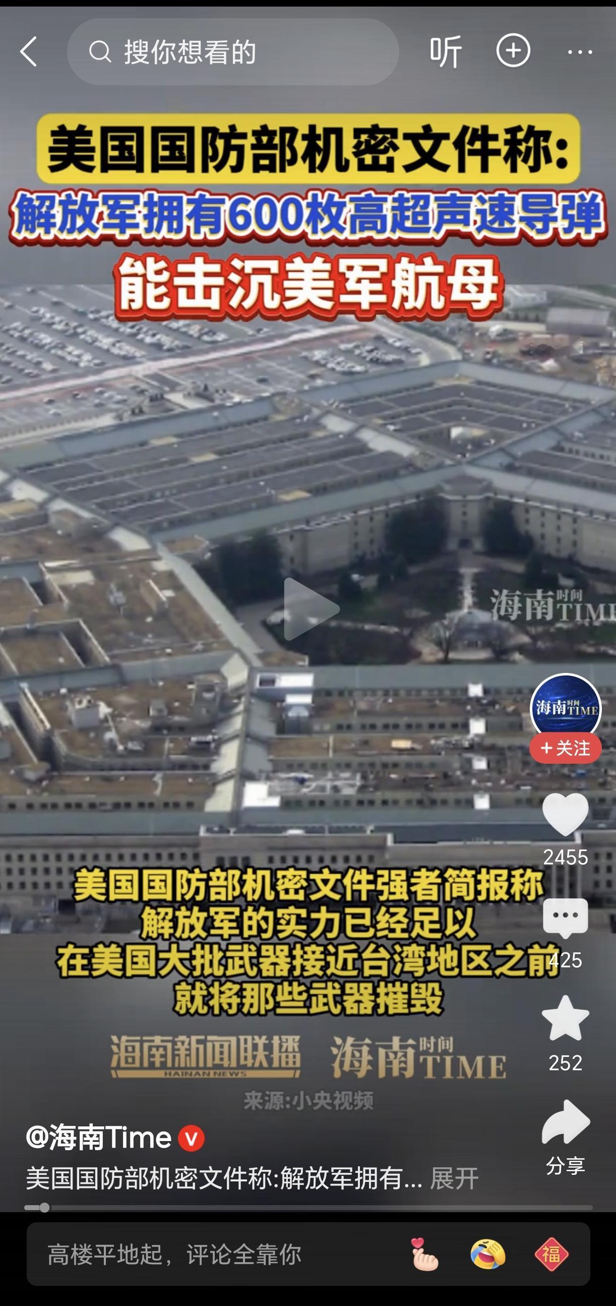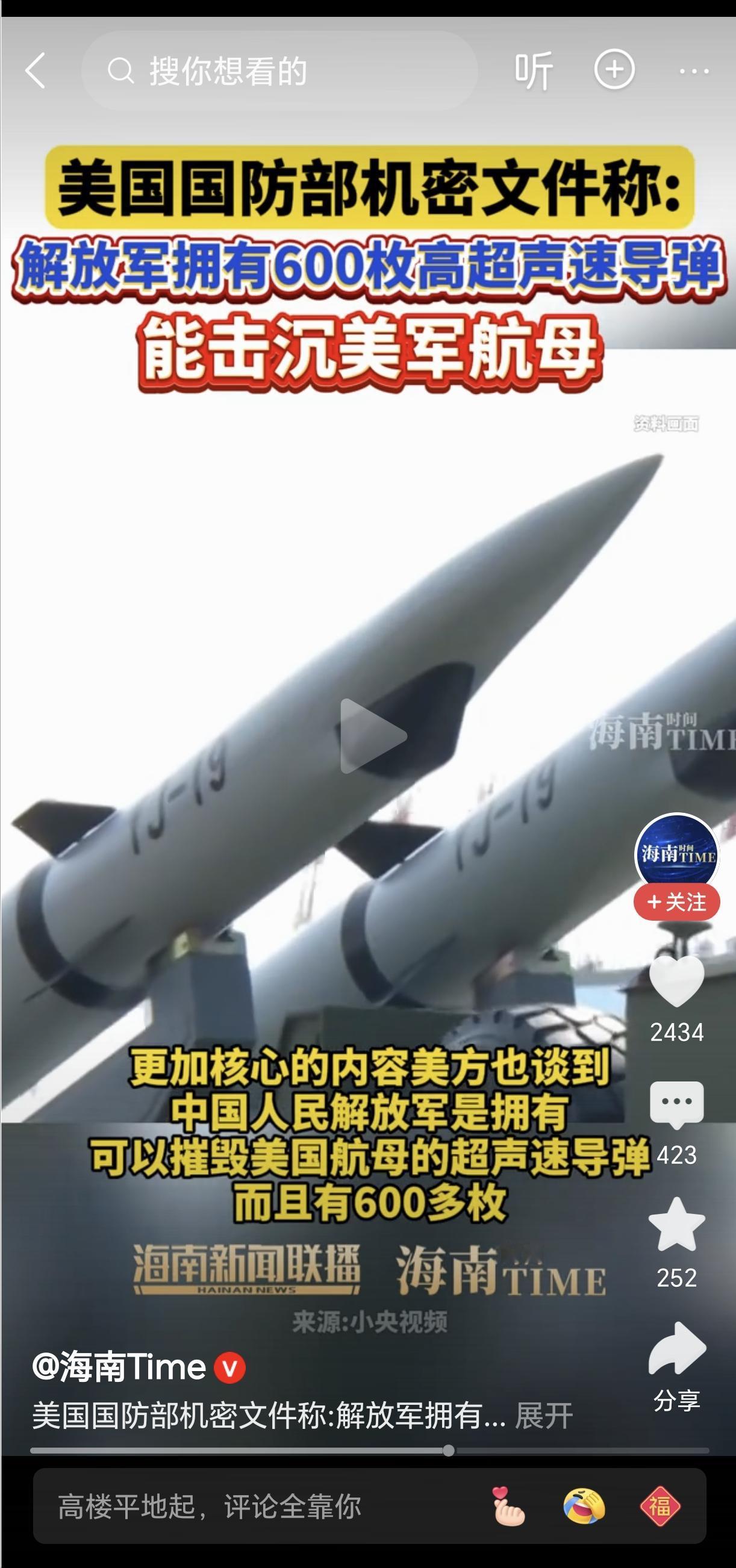 难怪美国防长绝对禁止与解放军冲突了! 根据媒体报道,近日,一份美国机密文件曝光,称解放军已经具备足够的实力,在美国大批武器接近台湾之前就将那些武器摧毁,同时文件也强调解放军拥有的可以摧毁航母的高超音速导弹有600多枚,而这样来看,大概也就明白为何美防长绝对禁止与解放军冲突了。 要知道,航母战斗群可是美国最拿得出手的底气,就拿福特级航母来说,一艘的造价就高达130多亿美元,上面还搭载着上百架战机,以前不管开到哪,都自带一股霸权威慑力。可在这份机密文件的台海兵推场景里,这造价百亿的大家伙根本撑不了多久,往往刚进入相关区域,就被解放军的导弹精准打击。 其实除了导弹数量让人震撼,解放军的反介入/区域拒止能力,也就是大家常说的A2/AD体系,才是真正让美国忌惮的核心王牌。这套体系专门克制美军航母编队投送和基地作战,投入成本不高但作战效果极强,能直接把美军的军事力量挡在第一岛链之外。 早在2015年,兰德公司就发布过相关报告,其中模拟台海冲突场景时就提到,一旦局势升级,中国导弹会密集打击,美国航母战斗群将面临惨重损失。到了2024年,美国国防部自己也不得不承认,中国的A2/AD体系已经成为他们在亚太地区面临的最大军事挑战。 说白了,这套A2/AD体系就是多兵种协同作战的“组合拳”:东风-21D、东风-26这类导弹部署在沿海地区,射程完全能覆盖第一岛链,只要美国航母敢在相关区域露面,高超音速导弹一个俯冲攻击就能让它吃大亏;黄海、南海海域还有潜艇潜伏待命,随时能发起突袭;空中有歼-20隐身战机巡航警戒,南海岛礁上还部署着S-400防空系统构建起防空屏障。 更关键的是,一旦美军的卫星链路被切断,他们的指挥系统就会直接陷入瘫痪。2023年太平洋论坛的评估报告也显示,这套体系的覆盖范围从东海延伸到南海,能有效阻止外军深度介入相关区域,整体作战性价比远超传统军事部署。 看懂这些,就不难明白美防长为啥反复强调绝对禁止与解放军冲突了。其实早在之前的公开场合,他就透露过,在针对中国的兵棋推演中,美军几乎就没赢过。现在这份机密文件一曝光,更是把这个事实坐实了:解放军能用成本相对低廉的大量导弹,换取美国造价昂贵的军事装备,这种“以小博大”的作战模式,直接让美国多年来的传统军事优势彻底失效。 过去美国靠航母编队实现力量投射、掌控海洋霸权,可现在解放军不光能把航母挡在关键区域之外,还能直接对其实施打击,等于断了美国在西太平洋的核心武力依仗。 更致命的是,美国自身的军事供应链早就问题重重,很多武器核心零件都依赖国外进口,真要是到了战时,补给根本跟不上节奏。 反观中国,工业基础雄厚扎实,导弹等武器装备能实现快速量产,在数量上完全占据优势。美国战略与国际研究中心(CSIS)的模拟结果也显示,一旦台海爆发冲突,美军在第一周就可能损失数艘航母,关岛、冲绳这些关键军事基地,也会沦为导弹打击的目标。 无论是冷战还是热战,针对中国的战争都打不得,也根本打不赢。现在这份机密文件算是把美国的“老底”彻底揭开了:嘴上喊得凶,实际心里比谁都清楚,跟解放军冲突就是赔本买卖。 美防长之所以把话说得那么死,坚决禁止与解放军发生冲突,说白了就是把双方的实力差距掂量得明明白白,不想拿美国的霸权地位去冒这个险。 毕竟六百多枚高超音速反航母导弹就摆在那,反介入体系也日趋成熟,解放军完全有能力捍卫国家主权和领土完整。美国要是真敢越过红线,别说往台湾运送武器了,自己的航母战斗群都得吃不了兜着走。难怪美国防长绝对禁止与解放军冲突了!