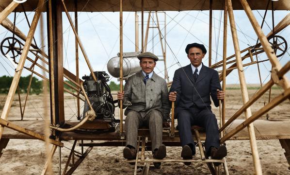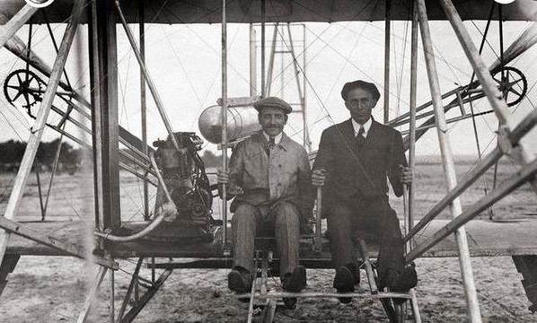 这是一张定格了人类航空史起点的历史照片,记录着1903年12月17日,莱特兄弟与他们的“飞行者1号”,刚刚完成了人类历史上首次持续、有动力、可操控的飞行。 画面中央是莱特兄弟,两人并肩坐在“飞行者1号”的简易座椅上,这架飞机完全是早期航空探索的实验形态,发动机等机械部件毫无遮挡地暴露在机身旁,座椅只是嵌在框架间的简单座具。