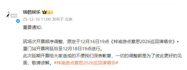 梓渝演唱会厦门站开票延后 梓渝厦门站开票延后 梓渝演唱会厦门站开票延后,咱就说期待住更好的舞台见面,坐等下次的开票时间啦,搓搓小手做好准备抢票啦~