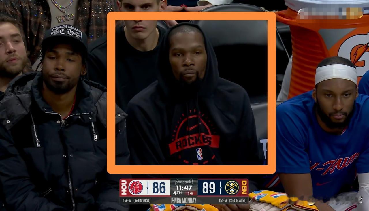 火箭当家球星杜兰特真是满怀焦虑!在今天进行的火箭和掘金的强强对话中,当时比赛进行