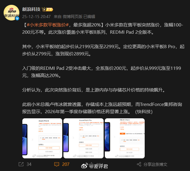 #差评说数码# 内存和存储成本上涨的结果,终究是传递到消费者这边了,小米已经有多款平板涨价,明年手机电脑啥的估计都要有大变化。就说手机,要么涨价要么降配,明年应该有很多型号会回到 8GB 内存起步的状态,中端点的机型掏个 6GB 出来也并非不可能。。。这么看下来今年发布的大存储机型 性价比就很高了,数码产品早买不仅早享受,这下还享折扣了