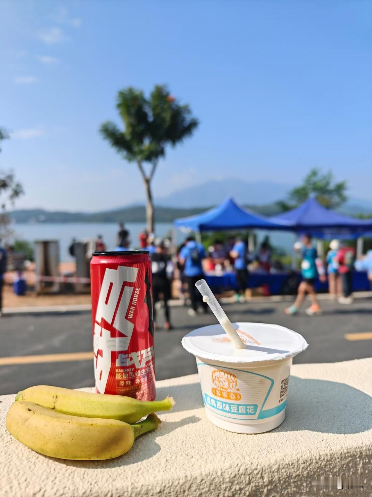 在户外赛事的补给点旁,阳光晒得石台暖融融的,摆着的香蕉、战马饮料和豆腐花,瞬间戳中了跑者的幸福感。 剥开黄澄澄的香蕉,甜糯的果肉下肚,瞬间补了点体力; 拧开战马的拉环,气泡混着能量感涌上来,跑了几公里的疲惫好像散了大半。 最惊喜的是这杯客家婆豆腐花,滑溜溜的嫩豆腐混着清甜的糖水,吸一口凉丝丝的,刚好压下烈日带来的燥热。 抬眼望去,湖面波光粼粼,远处的选手们三三两两走过,蓝帐篷下的志愿者忙前忙后,风里裹着青草和湖水的味道。 原来一场酣畅淋漓的奔跑后,最治愈的从来都是这些烟火气的小美好啊!