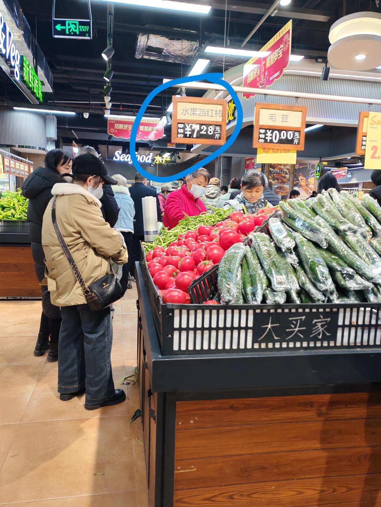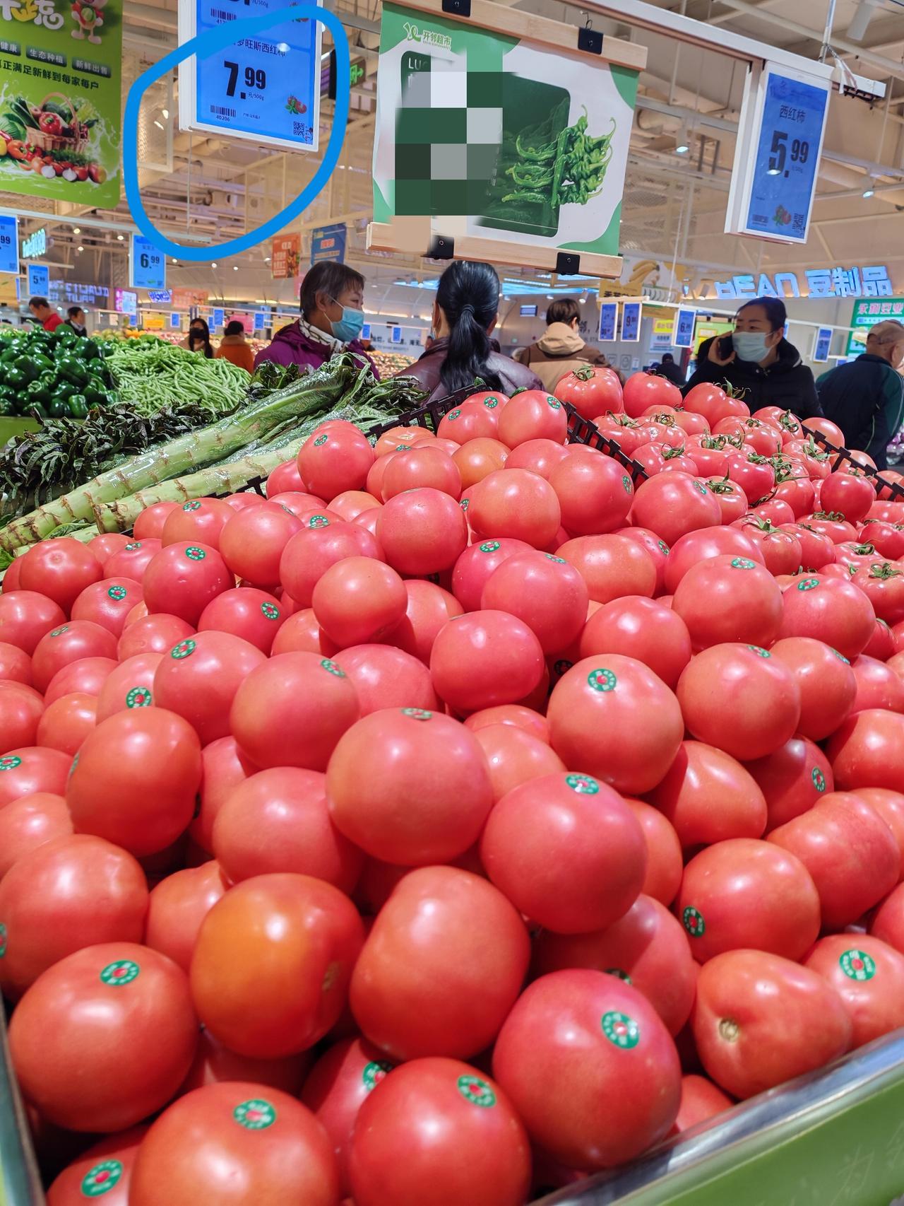 鸡蛋确实配不上西红柿喽 12月16日,这几天西安网友都在传西红柿太贵了,只能吃肉,今天我来求证一下。 中午来到单位附近的超市,见图一,水果西红柿每斤7.28元,果然不便宜,又看了一下鸡蛋,见图二,3.39元1斤。随后我又到了相距200多米的另一家超市,一看西红柿7.99元1斤,见图三。 事实胜于雄辩,看来洋柿子确实不便宜,西红柿,这一道陕西人餐桌上的万能配菜价格奔8元了,是鸡蛋价的两倍有余。 难怪我们单位最近工作餐都没有西红柿炒鸡蛋了,换成了鸡蛋炒洋葱,鸡蛋炒韭菜,肉沫蒸鸡蛋,原来是为了降低成本。 西红柿卖这么贵,总感觉有点不科学,前几年有蒜你狠,姜你军,似乎菜价被一只无形的手控制着,西安周边有大量的蔬菜基地,种植西红柿,按理说不应该很贵,问题出在哪,不知道外地现在的西红柿是什么价?