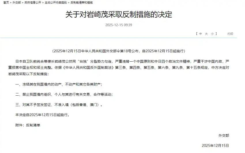 不再手下留情,精准打击日本反华势力! 12月15日,中国点名制裁日本自卫队前统合幕僚长岩崎茂,冻结其中国境内全部财产。 同时明确划出红线:任何与 “台独” 势力勾连挑衅、破坏国家主权的行为,都必将付出沉重代价。 这波操作来得又快又狠,让不少关注国际局势的朋友直呼 “大快人心”,也让外界清晰看到中国在维护国家核心利益上的坚定决心,再也不是说说而已。 这个岩崎茂到底是谁?为什么会被中方点名制裁?说起来,这位日本政客在反华和涉台议题上,可不是一般的 “活跃”。 公开资料显示,岩崎茂长期混迹于日本右翼政治圈,多年来一直担任日本某 “亲台” 团体的核心成员,打着 “学术交流”“民间往来” 的幌子,实则干着分裂中国的勾当。 他不仅频繁窜访中国台湾地区,与蔡英文当局的 “台独” 分子私下会面,还多次在公开场合发表歪曲历史、否认一个中国原则的言论,甚至推动日本国内出台针对台湾的所谓 “援助法案”,试图为 “台独” 势力站台撑腰。 最让人无法容忍的是,就在去年年底,岩崎茂趁着台湾地区所谓 “地方选举” 的敏感时期,偷偷跑到台湾。 不仅与 “台独” 骨干分子密谋会面,还公开宣称 “台湾是一个独立的国家”,这种赤裸裸的分裂言论,直接触碰了中国的红线。 更过分的是,他还牵头组织日本右翼势力与 “台独” 分子签订所谓 “合作协议”。 计划在政治、军事、舆论等多个层面为 “台独” 分裂活动提供支持,其行为已经严重违反一个中国原则,破坏了台海地区的和平稳定,也伤害了中国人民的民族感情。 事实上,中方对岩崎茂的反制早有预警。 此前,中国外交部就曾多次召见日本驻华使节,就岩崎茂等人的涉台恶劣行径提出严正交涉,要求日方立即制止相关行为,撤销对 “台独” 势力的支持。 但日方不仅置若罔闻,反而纵容岩崎茂继续搞分裂活动,甚至为其行为站台背书。 在多次警告无效、分裂行径愈演愈烈的情况下,中方终于果断出手,祭出反制大招。 冻结岩崎茂在中国境内的所有银行存款、房产、投资等资产,同时将其列入 “反华分裂分子黑名单”,禁止其入境中国内地及香港、澳门特别行政区,相关关联企业也将受到限制。 这波制裁可不是 “走过场”,而是精准打击到了岩崎茂的痛处。 据悉,岩崎茂多年来通过与中国境内一些企业的合作,积累了不少资产,在上海、苏州等地还持有商业房产和投资项目,此次资产被冻结,直接让他在经济上遭受重创。 更重要的是,被列入禁止入境名单后,他再也无法借着 “商业考察”“文化交流” 的名义进入中国,其背后的右翼势力与 “台独” 分子的勾连渠道也被狠狠切断。 有知情人士透露,岩崎茂得知资产被冻结后,曾试图通过日本政府向中方施压,但中方明确回应:“分裂国家的代价,必须自己承担,任何说情都无效。” “台独” 分裂势力就像跳梁小丑,而岩崎茂这种外部势力,就是给小丑递话筒、递刀子的帮凶,他们的行为不仅破坏台海和平,还严重伤害中国人民的感情,不制裁他制裁谁? 有意思的是,这波制裁还引发了连锁反应。 日本国内不少企业开始慌了,纷纷跟岩崎茂划清界限 —— 之前跟他合作的 3 家日本制造业企业,短短 3 天内就发布声明终止合作。 他担任顾问的两家日本文旅公司,也连夜把他的名字从官网删除。毕竟没人愿意因为一个反华政客,失去中国这个大市场。 从制裁美国对台军售企业,到拉黑窜台的外国政客,再到限制相关人员的经济活动,每一次出手都精准打击到了分裂势力的要害,也让外界看到了中国维护国家核心利益的坚定决心和强大能力。 国际社会对此也高度关注。不少国家纷纷表态支持一个中国原则,认为中方的反制措施合理合法,是维护国家主权和领土完整的正当行为。 中方一直以来都致力于维护台海和平稳定,也始终愿意与世界各国在相互尊重、平等互利的基础上发展关系。 但这一切的前提,是对方必须尊重中国的核心利益和重大关切,必须坚持一个中国原则,停止支持 “台独” 分裂势力。 如果有人误以为中国会为了所谓的 “外交大局” 而牺牲国家主权,那就大错特错了。 信源:新京报2025-12-15——《中方:对日本自卫队前统合幕僚长岩崎茂采取反制措施》
