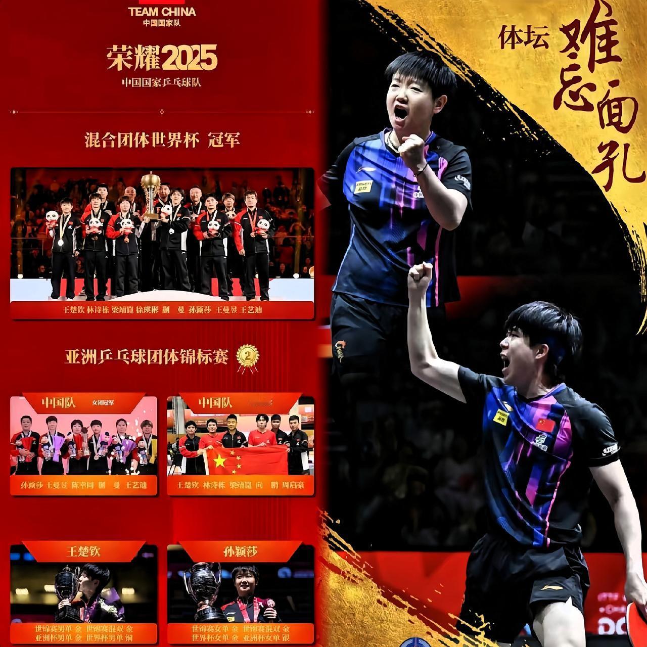国家队2025年终总结出来了, 莎莎和大头妥妥的排面! 莎莎: 世锦赛女单和混双冠军, 世界杯女单金牌,亚洲杯摘银! 楚钦: 世锦赛单打和混双双冠王, 亚洲杯夺冠,世界杯也拿下铜牌! 但说实话, 无论什么奖牌, 在咱们心里都比不过你们身体好好的! 关注“莎头”的这两年, 场上实力没话说, 场下也一直那么踏实努力。 真希望未来你们能把健康放在首位, 只有身体棒棒的, 才能走得更远, 拿更多冠军, 继续为国家争光!