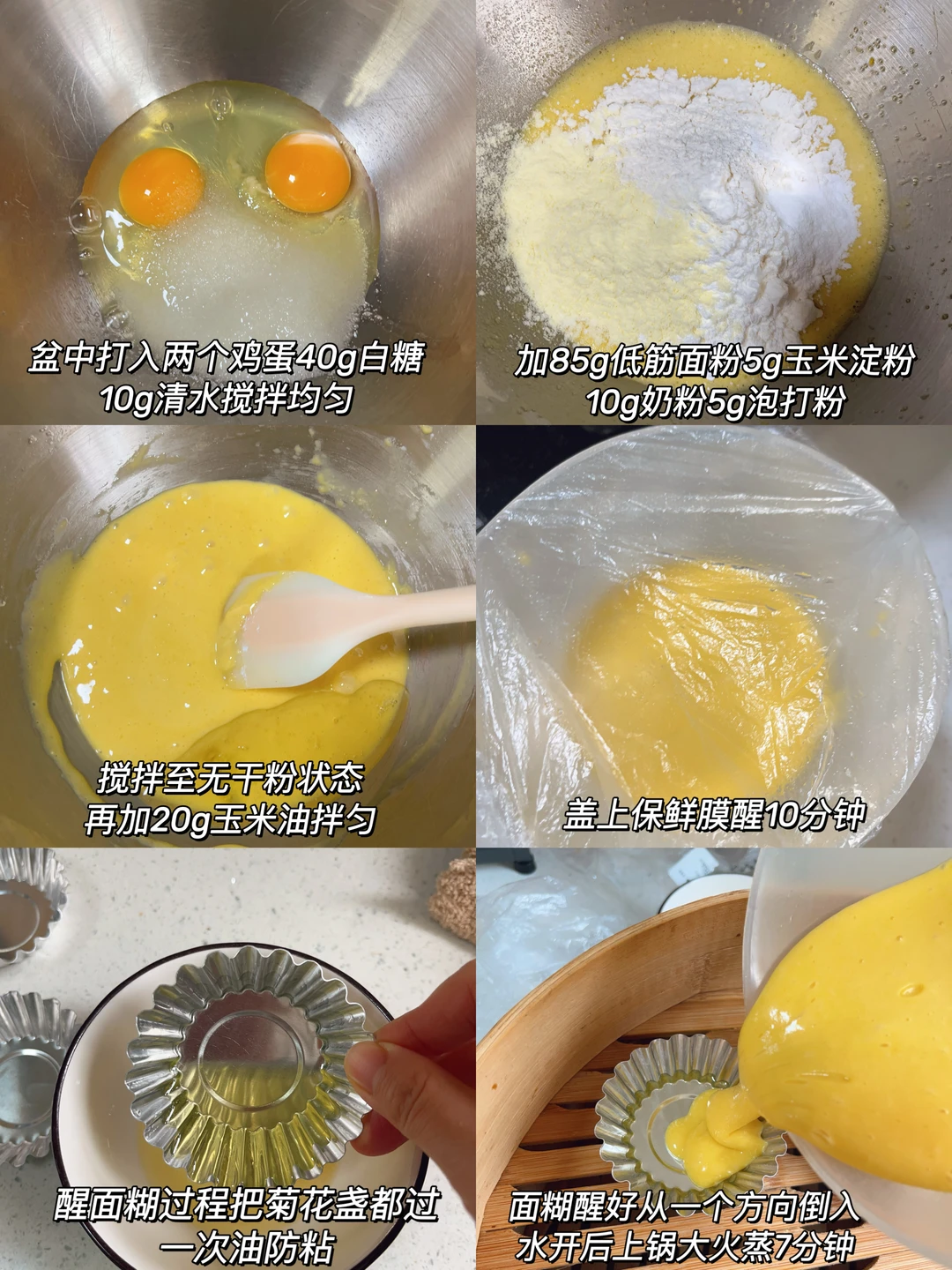 3⃣️面糊醒好后从菊花盏的一个方向倒入面糊、水开后上锅蒸7分钟即可