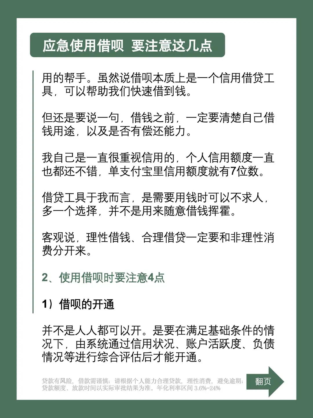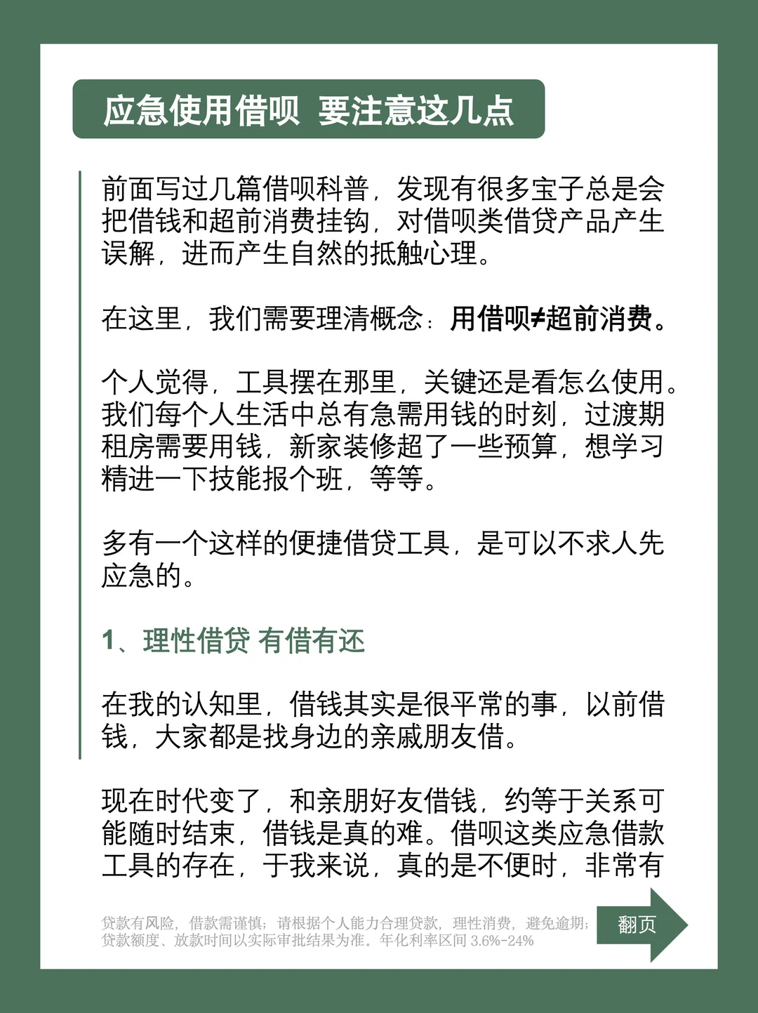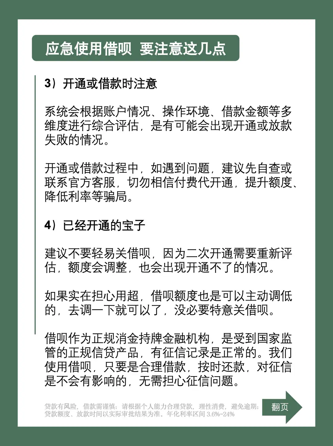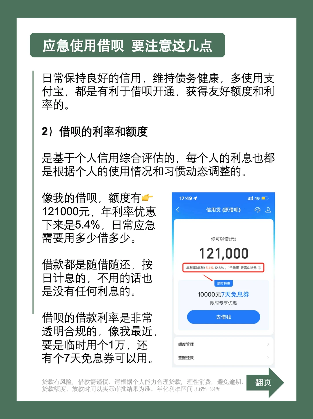 · 前面写过几篇借呗科普,发现有很多宝子总是会把借钱和超前消费挂钩,对借呗类借贷产品产生误解,进而产生自然的抵触心理。在这里,我们需要理清概念:用借呗≠超前消费。工具摆在那里关键看怎么使用,我们每个人生活中总有急需用钱的时刻,过渡期租房需要用钱,新家装修超了一些预算,想学习精进一下技能报个班等等,多一个这样的便捷借贷工具,是可以不求人先应急的。 · 1⃣️理性借贷,有借有还 在我的认知里,借钱是很平常的事,以前借钱,大家都是找身边的亲戚朋友借,现在时代变了,借钱真的难。借呗这类应急借款工具的存在,真的是我不便时,非常有用的帮手。虽然说借呗本质上是一个信用借贷工具,可以帮助我们快速借到钱。但还是要说一句,借钱之前,一定要清楚自己借钱用途,以及是否有偿还能力。我自己一直很重视信用,借贷工具于我而言,是需要用钱时可以不求人,多一个选择,并不是用来随意借钱挥霍。客观说,理性借钱、合理借贷一定要和非理性消费分开来。 · 2⃣️使用借呗时要注意4点 1)借呗的开通 并不是人人都可以开。要在满足基础条件的情况下,由系统通过信用状况、账户活跃度、负债情况等进行综合评估后才能开通。日常保持良好的信用,维持债务健康,都是有利于借呗开通,获得友好额度和利率的。 2)借呗的利率和额度 是基于个人信用综合评估的,非常透明,每个人的利息也都是根据个人的使用情况和习惯动态调整的。像我的额度有121000,年利率优惠下来是5.4%,需要多少借多少,随借随还,按日计息,不用的话没有任何利息。 3)开通或借款时 系统会根据账户情况、操作环境、借款金额等多维度进行综合评估,可能会出现开通或放款失败的情况,遇到问题一定先自查或联系官方客服,切勿相信付费代开通,提升额度、降低利率等骗局。 4)已经开通的宝子 建议不要轻易关借呗,因为二次开通需要重新评估,额度会调整,也会出现开通不了的情况。如果实在担心用超,借呗额度是可以主动调低的,没必要特意关借呗。借呗作为正规消金持牌金融机构,是受到国家监管的正规信贷产品,有征信记录是正常的。我们使用借呗,只要合理借款,按时还款,对征信是不会有影响的。 · 贷款有⻛险,借款需谨慎;请根据个⼈能⼒合理贷款,理性消费,避免逾期;贷款额度、放款时间以实际审批结果为准。年化利率区间 3.6%-24%