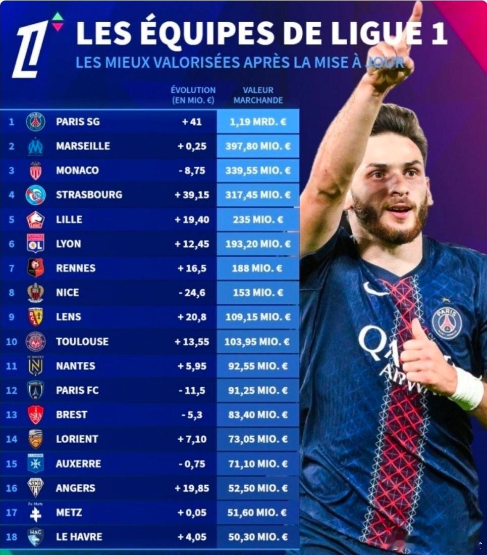 德转列法甲各队身价榜最新排名:巴黎断层领先 比前四的球队总和还高德国转会市场网站盘点了法甲球员各队身价排行榜单,巴黎圣日耳曼以11.9亿欧元领跑榜首,马赛3.98亿欧元位居第二,摩纳哥3.4亿欧元排名第三。巴黎圣日耳曼全队身价不仅高居榜单第1的位置,他们甚至比第1和第3名的马赛和摩纳哥的总和都来得还高。作为法甲各队身价排行榜单领跑的球队,巴黎圣日耳曼全队是唯一一支全队总身价达到10亿欧元以上的球队。马赛、摩纳哥和斯特拉斯堡的身价分别保持在3亿欧元之间之间,而里昂尔则是唯一的一队身价在2亿欧元之间的球队。另外有三支球队身价保持在1亿欧元左右,包括里昂、雷恩、尼斯、朗斯、图卢兹。从排名第11位的球队开始,他们的身价均没有达到1亿欧元。德转列法甲各队身价榜:欧元1.巴黎圣日耳曼,11.90亿2.马赛,3.98亿3.摩纳哥,3.40亿4.斯特拉斯堡,3.17亿5.里尔,2.35亿6.里昂,1.93亿7.雷恩,1.88亿8.尼斯,1.53亿9.朗斯,1.09亿10.图卢兹,1.04亿11.南特,0.93亿12.巴黎FC,0.91亿13.布雷斯特,0.83亿14.洛里昂,0.73亿15.欧塞尔,0.71亿16.昂热,0.53亿17.梅斯,0.52亿18.勒阿弗尔,0.50亿