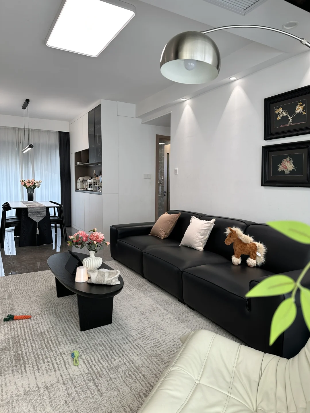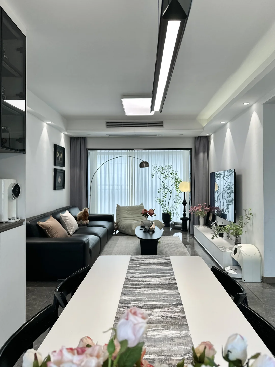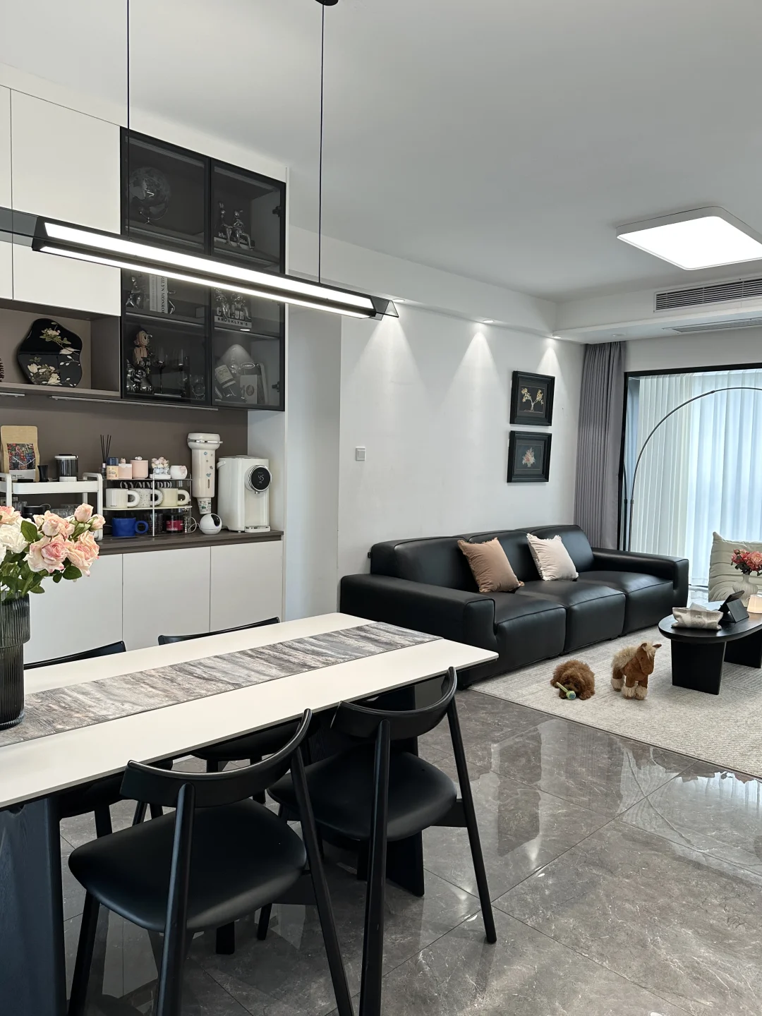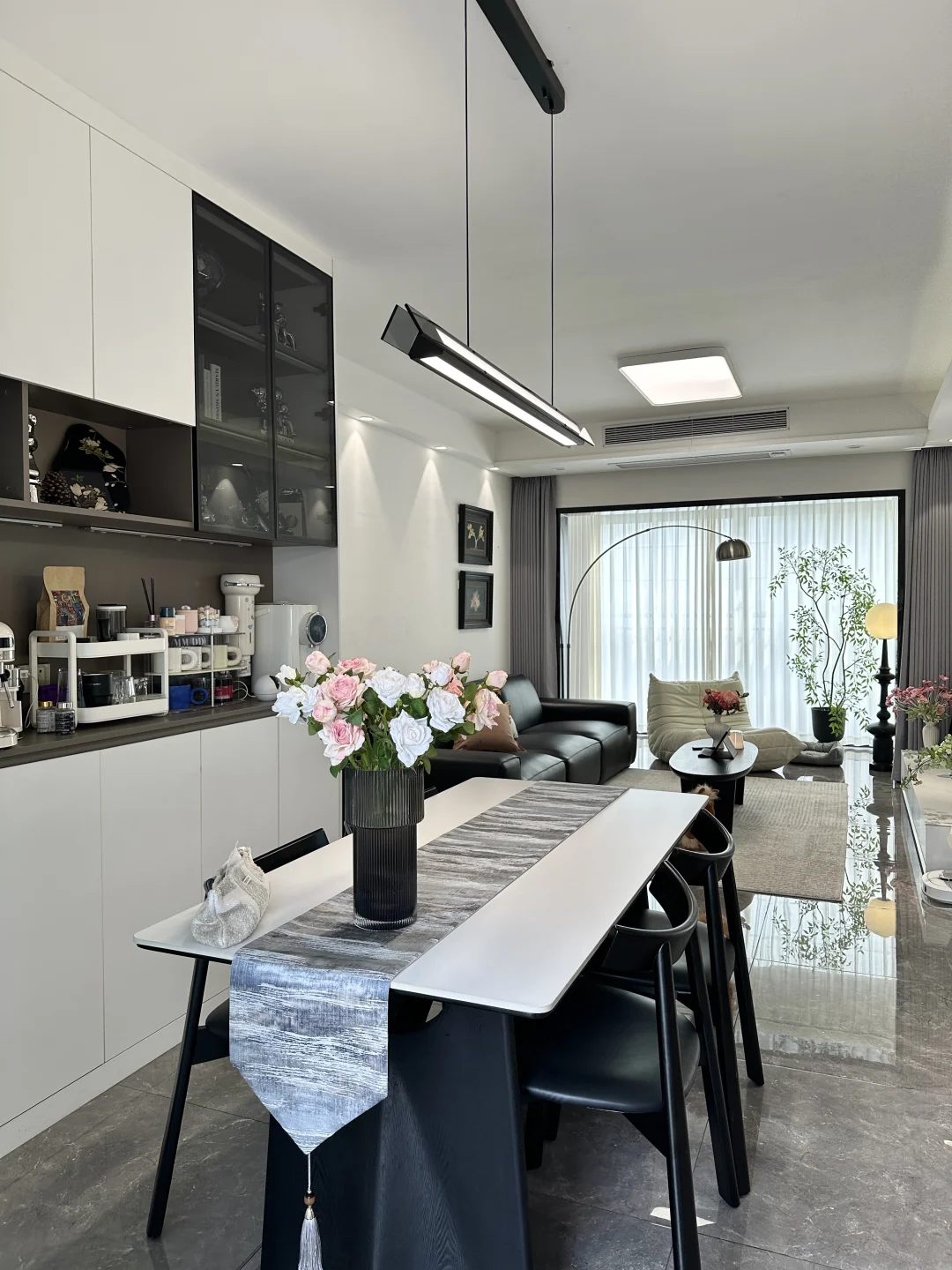 120平精装,套内只有90平 从没想过,软装搭配后的家,在小区出名了 硬装没做太大的改动,封窗后就软装凑了~ 客餐厅一体,双阳台户型 南北对流采光和通风都是很好的 不改瓷砖颜色,搭配成教学的黑白灰风格 虽然谈不上高级感,但是搭配后还是很满意的 客厅没有复杂的背景墙,大白墙也很百搭 餐厅做了一个收纳为主的满墙餐边柜 放下了1.6米餐桌,餐厅灯搭配了棱镜吊灯 开灯后的温馨氛围感扑面而来 房子虽然不大,却装下了我满满的❤️ 日子要平淡,但是不要将就!