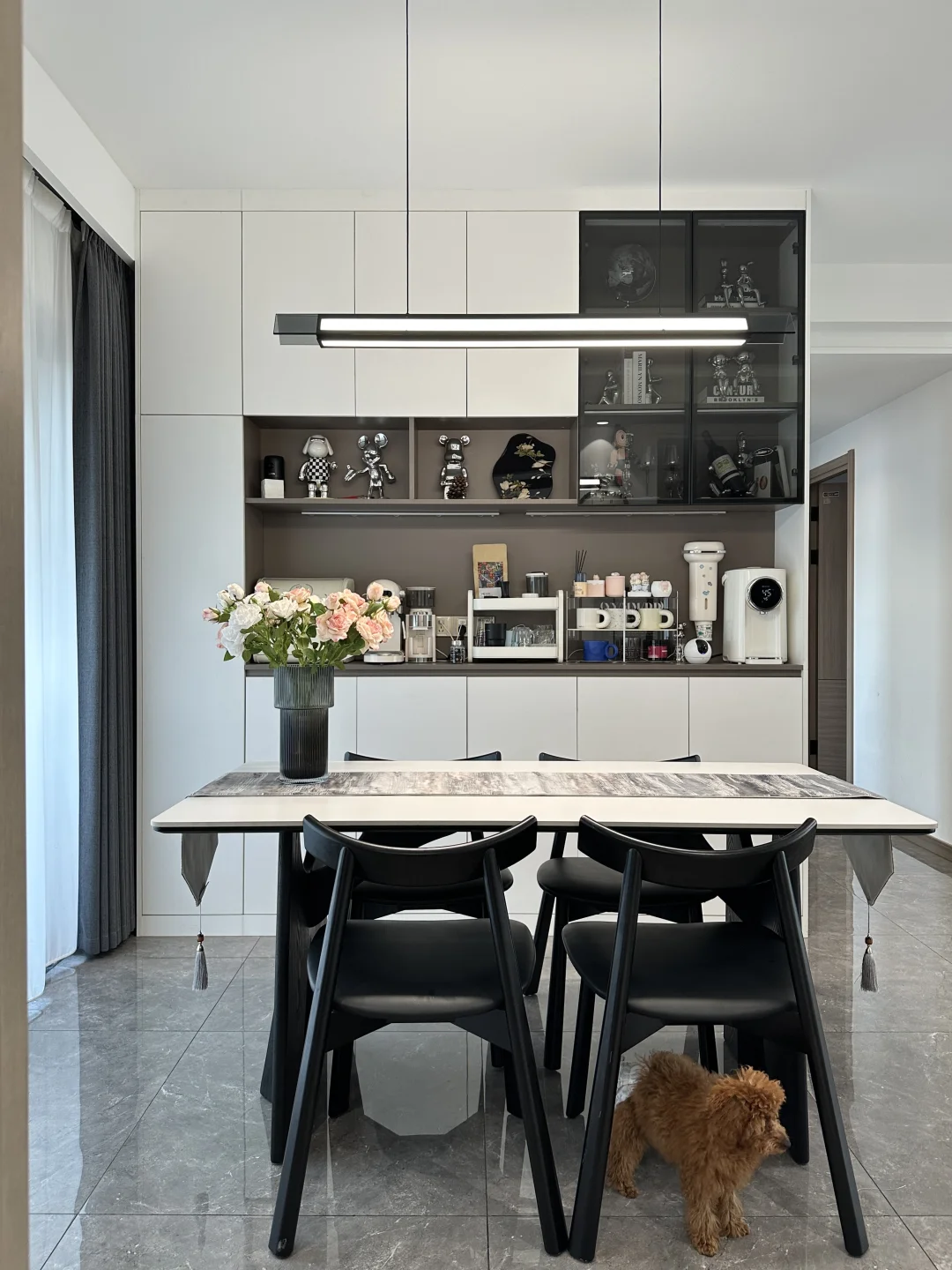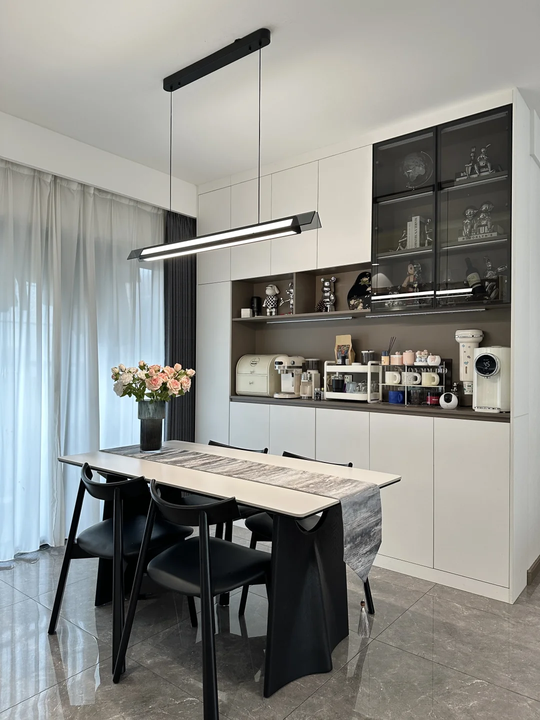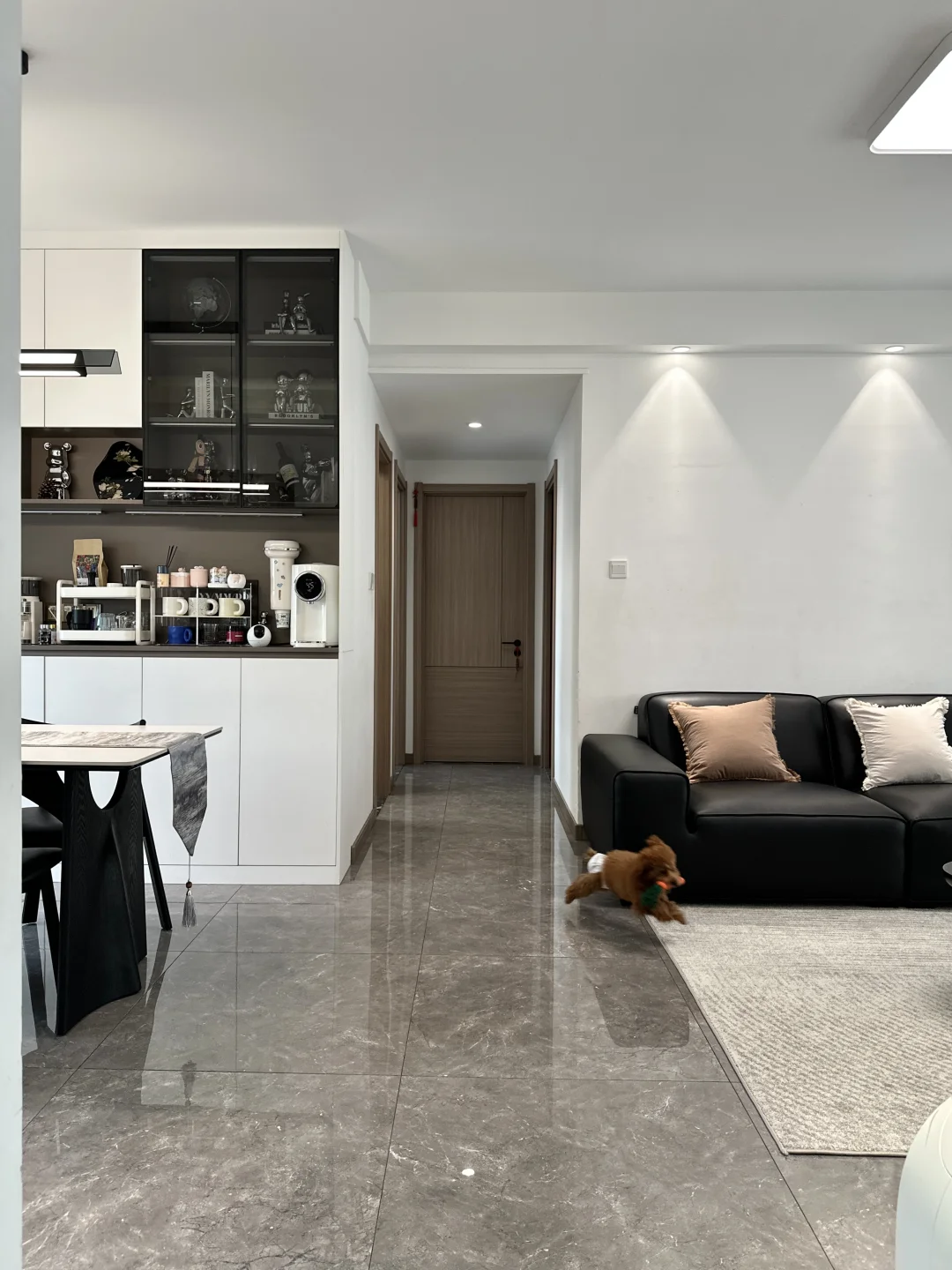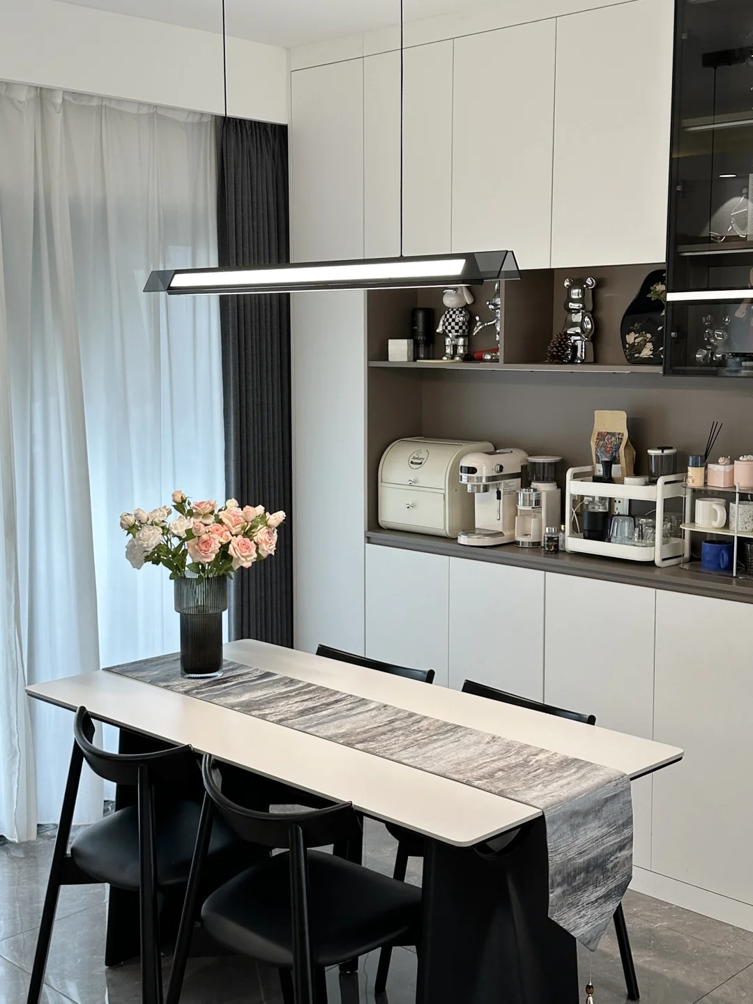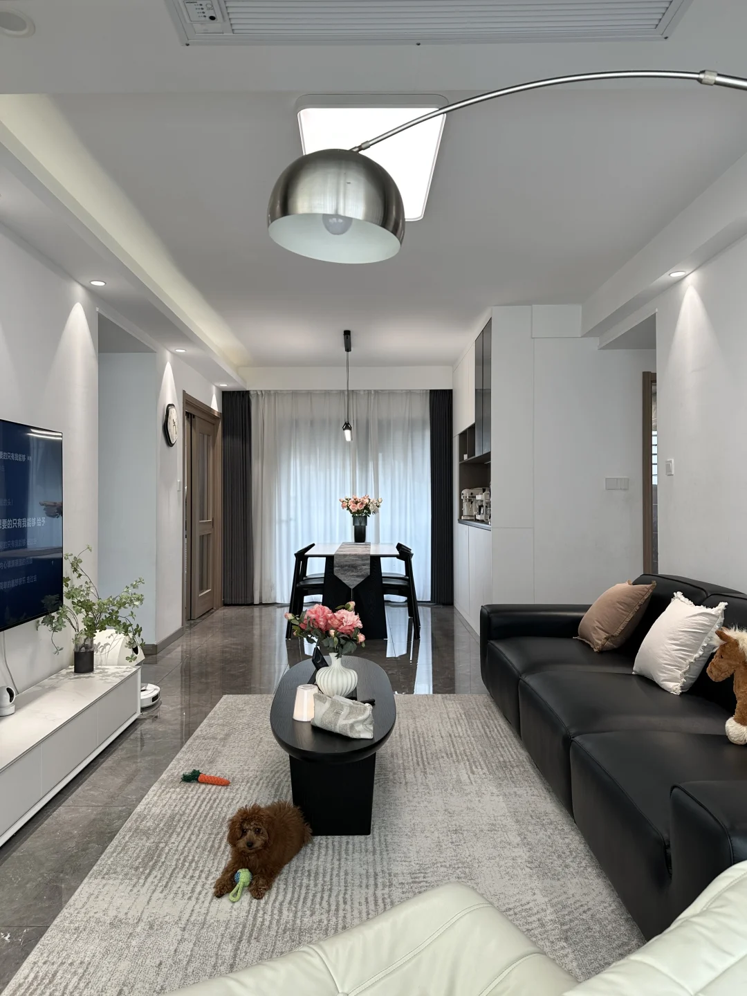 120平精装,套内只有90平 从没想过,软装搭配后的家,在小区出名了 硬装没做太大的改动,封窗后就软装凑了~ 客餐厅一体,双阳台户型 南北对流采光和通风都是很好的 不改瓷砖颜色,搭配成教学的黑白灰风格 虽然谈不上高级感,但是搭配后还是很满意的 客厅没有复杂的背景墙,大白墙也很百搭 餐厅做了一个收纳为主的满墙餐边柜 放下了1.6米餐桌,餐厅灯搭配了棱镜吊灯 开灯后的温馨氛围感扑面而来 房子虽然不大,却装下了我满满的❤️ 日子要平淡,但是不要将就!