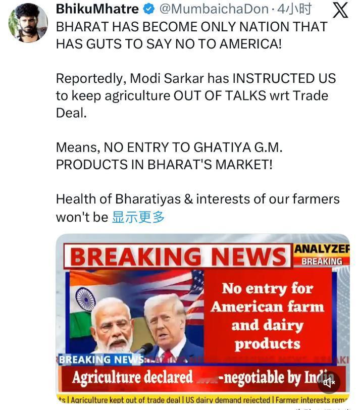 印媒称,印度已成为唯一一个敢于对美国说“不”的国家! 据报道,莫迪政府已指示不要将农业问题纳入与美国的贸易协定谈判。 这意味着,劣质转基因产品不得进入印度市场!印度人民的健康和农民的利益绝不会受到损害。如果美国想要达成协议,那就必须接受印度的条件。 这事要是放在十年前,可能大家都不太敢想。当时印度还在为跟美国建立更紧密的关系做各种让步,从信息技术到能源合作,基本上是有求必应。 但现在情况变了,尤其是在食品安全这个问题上,印度态度强硬了不少。原因其实也不复杂,印度过去几年在农业现代化和本土农业保护上投入巨大。 如果现在贸然开放市场,让国外的廉价农产品尤其是转基因产品大举入侵,不仅本地农民的生计问题立刻就会爆发,而且整个国家对粮食质量的控制也会面临挑战。 说到底,这不是简单的技术问题,而是一个涉及农村经济、食品主权和国家安全的系统性问题。有人可能觉得转基因不就是个科学进步吗。 但在印度,事情没那么简单。印度农民自杀率一直被国际社会关注,其中一个重要原因就是高成本的农资投入和市场价格不稳定。 而如果美国产的转基因种子和农药大规模进入市场,很可能让本地农民进一步失去竞争力。印度政府这次的决定,某种程度上是对国内舆论和农民群体的回应。 同时也是对美国长期以来在贸易谈判中采取强硬姿态的一种反制。这场较量其实是有背景的。从特朗普时期开始,美印之间的贸易谈判就一直不太顺利。 美方希望印度降低关税、开放市场,特别是在农产品、医疗器械和电子产品等领域,而印度则一直坚持保护本国产业,尤其在农业和健康领域尤其敏感。 特朗普政府虽然在某些政策上有所调整,但在贸易谈判上依旧延续了强硬立场。如今印度明确拒绝将农业问题纳入谈判,不仅是一次技术性的谈判策略调整。 更是对美方长期施压的一次实质性反击。值得注意的是,印度并不是完全不跟美国谈合作。比如在高科技、国防、清洁能源方面,印美之间的合作还是很密切的。 但一旦涉及到本国核心利益,特别是影响到十几亿人口吃饭问题的时候,印度政府的底线就非常清晰。这背后其实还有一点不容忽视。 那就是印度现在的国际地位确实发生了变化。自从成为全球第五大经济体之后,印度在不少国际场合已经不再甘于当配角。 再加上近年来跟俄罗斯、东盟、中东、非洲等多个经济体建立了相对多元的合作关系,使得印度在面对美国时的谈判底气更足。 而且这一次的态度强硬也不能简单理解为对美国说“不”,更准确地说,是印度在用一种更成熟的方式表达自己的国家利益。在全球格局越来越不确定的背景下。 很多国家都在重新评估自己与传统大国的关系。比如同样在这两年,法国在对美政策上也有不少调整;德国在能源政策上也开始寻求更多自主空间。 而印度这次的决定,更像是在告诉所有人:新兴经济体不是没有选择,也不是只能接受条件。尤其在如今全球供应链重组的大背景下,印度既要争取做制造业中心,也要守住自己农业的基本盘。 这事儿其实也提醒我们一个现实,那就是所谓“全球化”,并不意味着每个国家都得完全开放自己最脆弱的领域。过去很多国家在跟美国谈判时,容易陷入一种路径依赖。 觉得只要满足美方要求就能换来好处。但现在越来越多的国家意识到,真正的经济安全和发展潜力,其实来自于对自身优势的保护和对外合作的平衡。 印度能在这个时间点做出这样的决策,说明他们对自己的发展路径已经有了更清晰的判断。总的来说,这次印度对美国说“不”,并不是一句口号那么简单。 而是背后有着对国内农业保护、国际谈判策略、国家发展方向的综合考量。它不只是一个新闻事件,更是当今国际秩序变化的一面镜子。 美国仍然是全球最强大的经济体不假,但它在全球的议价能力,已经不像以前那么绝对。像印度这样敢于在关键议题上坚持自身立场的国家越来越多。 这也预示着未来国际贸易的规则将更加复杂多元。而对印度来说,这样的选择可能会带来短期的摩擦,但从长远看,却是维护本国利益的一步关键棋。